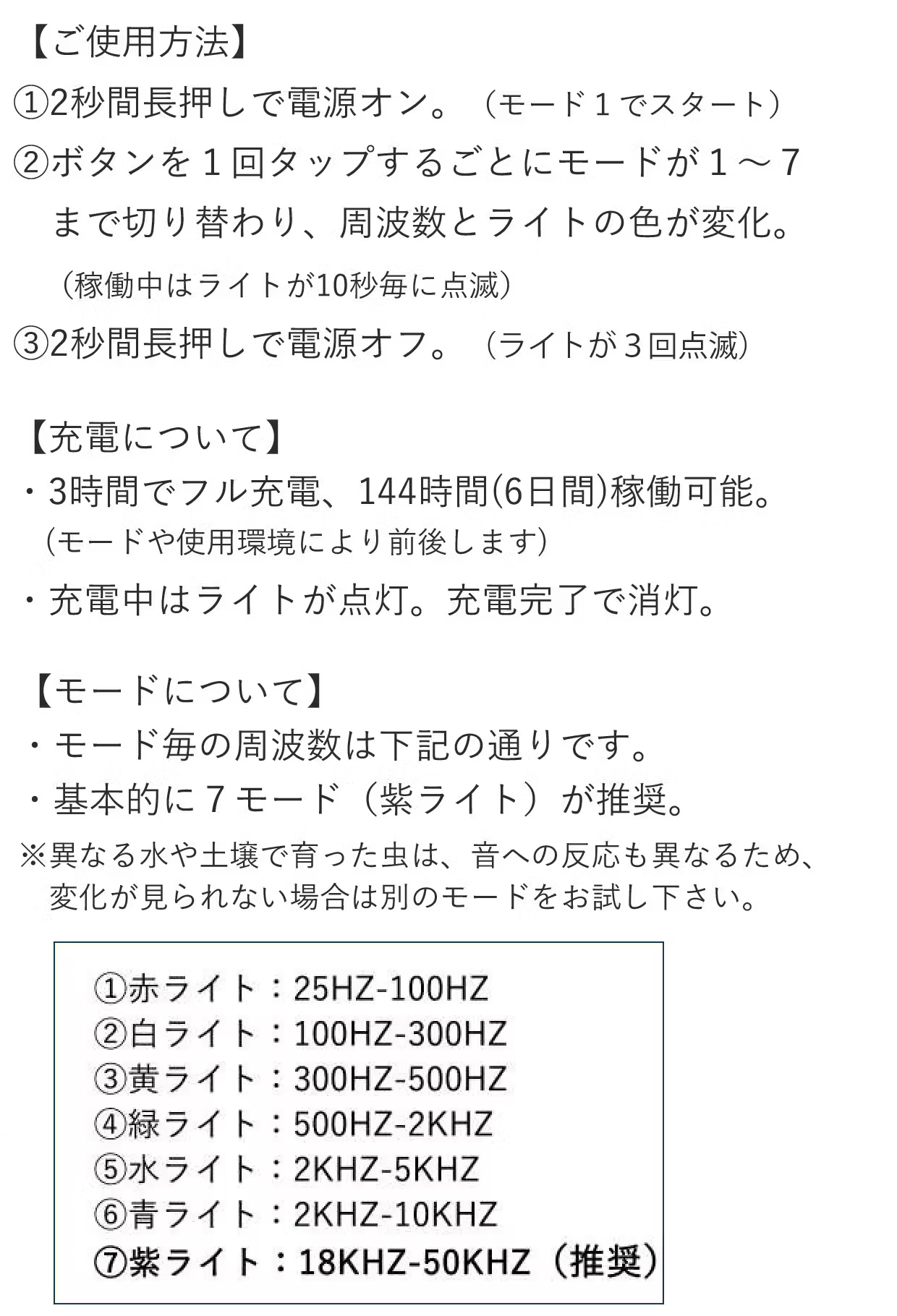 ①虫が嫌がる7種類の音に、3種の光をプラス。360度全方位に広がる、頼れる虫除けバリア。