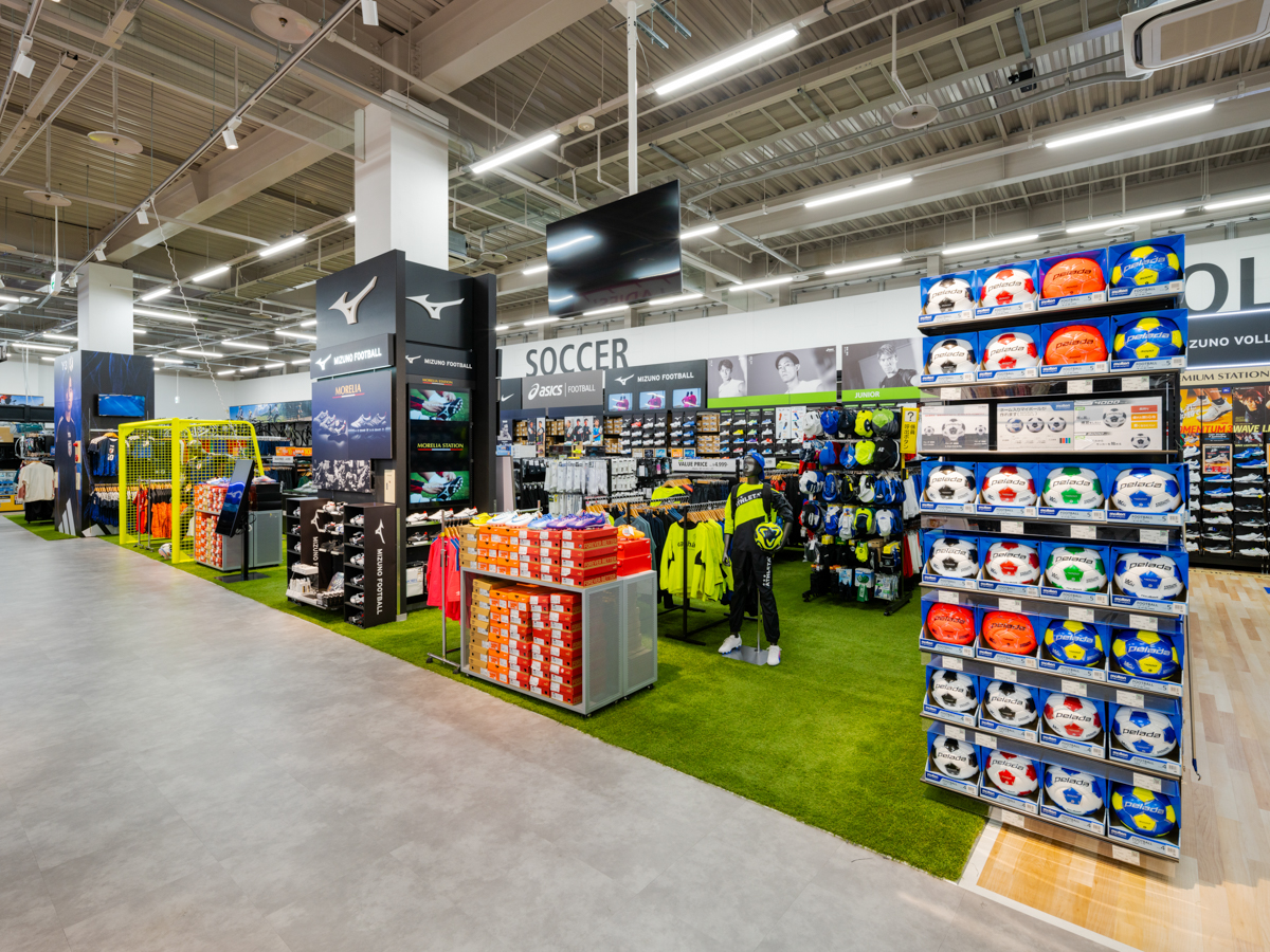 全面に人工芝を敷き詰め、オンピッチを彷彿させる「リアル体験型」の売り場で実際に商品をお試しいただけます。ミズノの「モレリアジャパン」を扱う〈モレリアステーション〉をはじめ、ナイキの「ELITE」シリーズなど、こだわりの一足が見つかる希少性の高い人気モデルを幅広く展開。アシックス、アディダス、プーマなど、レベルを問わず豊富な品揃えです。ジュニアシューズも16cmから展開と充実しており、成長期のお子様の足に負担をかけないフィット感抜群のシューズをお選びいただけます。アスレタ、プーマ、ナイキ、アンブロなどの人気ブランドウェアや、タビオを中心とした機能ストッキングも豊富にご用意しています。