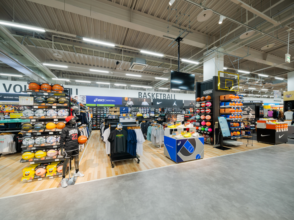 ナイキ、ジョーダン、アシックスなど人気ブランドが勢揃い。ルカやテイタムといった注目度の高いシグネチャーシューズのラインナップも充実しています。売り場はNBAのバスケットコートで使用されている北米産ハードメイプル材のフローリングを採用し、プレイシーンさながらの世界観で試着が可能です。