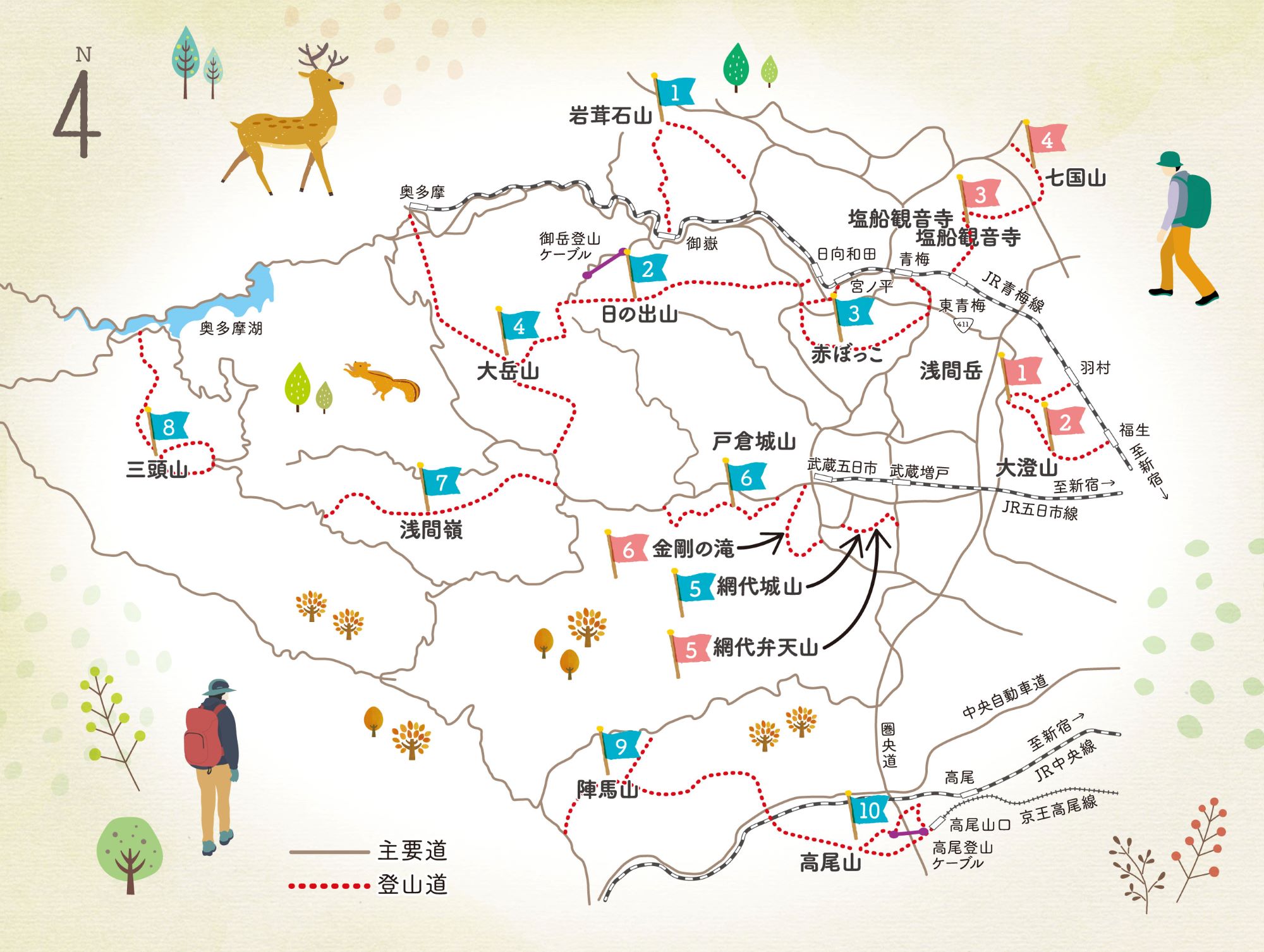 山頂からのパノラマが美しい10の山を巡ります。周辺の多摩の山々や富士山、東京都心部など、登る山によってさまざまな眺望が楽しめます。