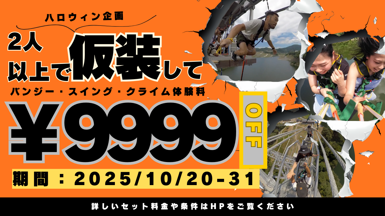 まず1つ目は『ペアで仮装し、9,999円OFF!ハロウィン限定イベント』で、ブリッジバンジー、ブリッジスイング、ブリッジクライムのうちから2つ以上のアクティビティを2人以上で仮装して参加すると、料金が9,999円引きになるお得なイベントです。