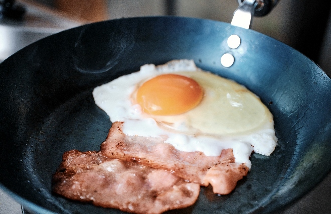 鉄フライパンと聞くと「サビ」「こびりつき」を思い浮かぶ方が多いと思います。アルミやステンレスのフライパンと使い方が異なりますので、弊社スタッフが「使い始め〜使用後のお手入れ」までご説明いたします。「目玉焼き」焼きます。