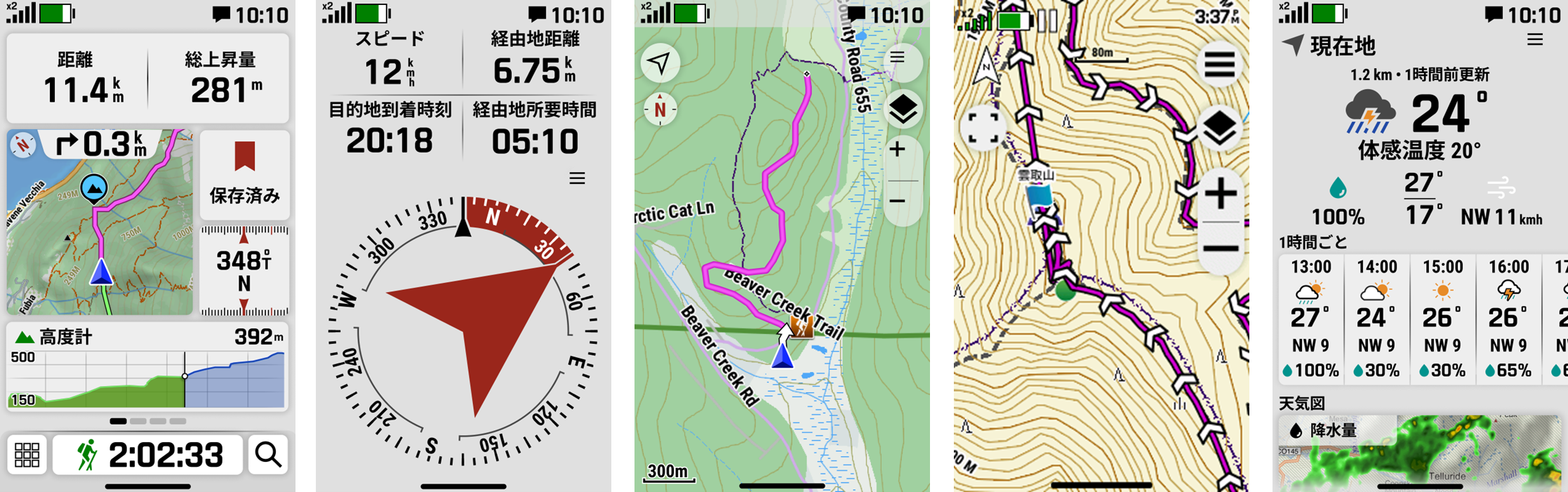 オートルート機能、ライブジオキャッシング、トラックバック、LiveTrack、天気予報・通知など |
