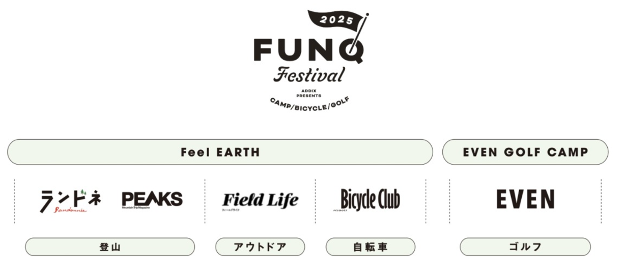 アクティブな趣味人のメディア『FUNQ』が企画・主催する『FUNQ Festival』は、“好き”をテーマにした新しい体験型イベントです。登山・アウトドア・自転車・ゴルフといった各分野で熱狂的な読者を抱える専門誌がコンテンツプロデュースを担い、趣味初心者からマニアまで楽しめるプログラムを展開します。今回開催したキャンプイベント「Feel EARTH 2025」のほか、ゴルフイベントも同時開催しました。