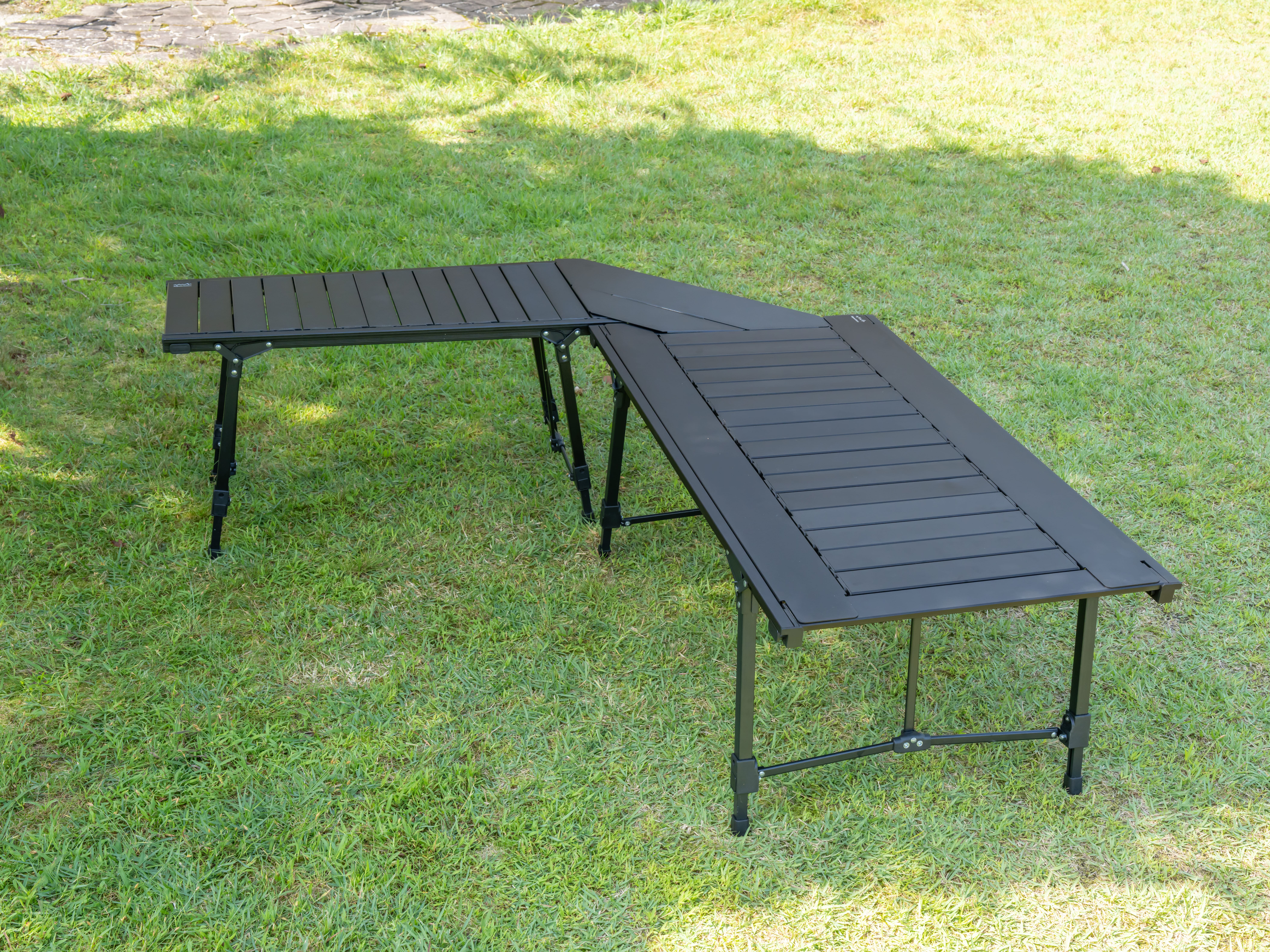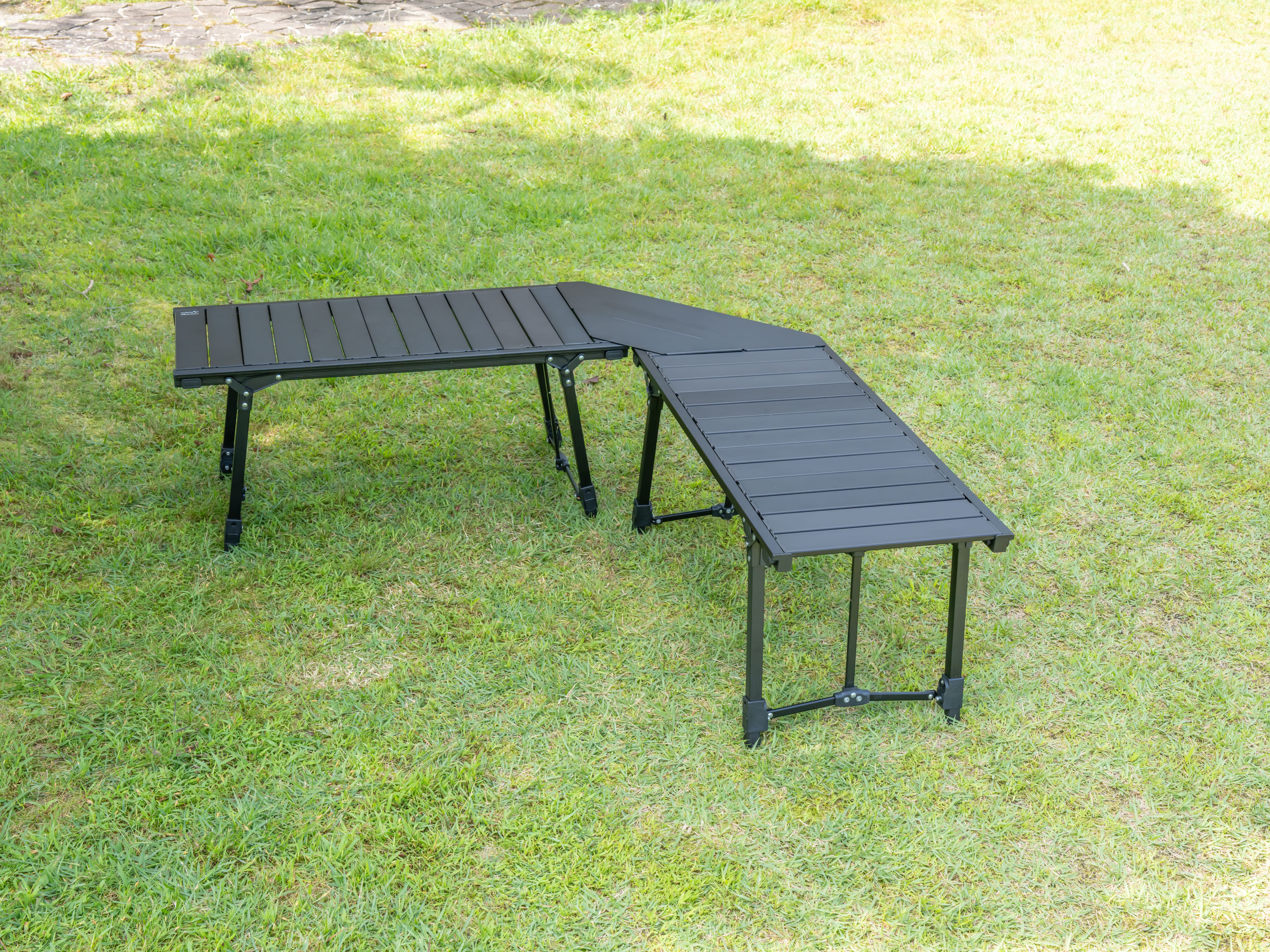 あわせて、「アルミユニットテーブル」をさらに快適にカスタマイズできるオプション3アイテム「アルミコーナー天板88」「アンダーラックフレーム88」「アルミ天板」も同日から販売開始いたします。中でも「アルミコーナー天板88」はキャンプサイトのレイアウト自由度を高める注目アイテムです。