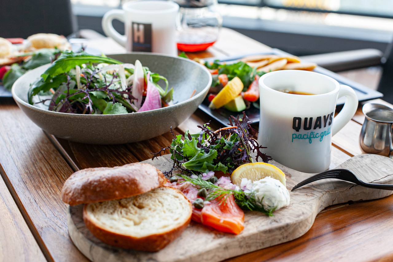 海が目の前の開放的なハンマーヘッドパークでのんびり朝ヨガ。ヨガのあとはレストラン「QUAYS pacific grill」の野菜やフルーツが楽しめる朝食でエネルギーをチャージ。身体も心もほぐれる朝をむかえましょう。