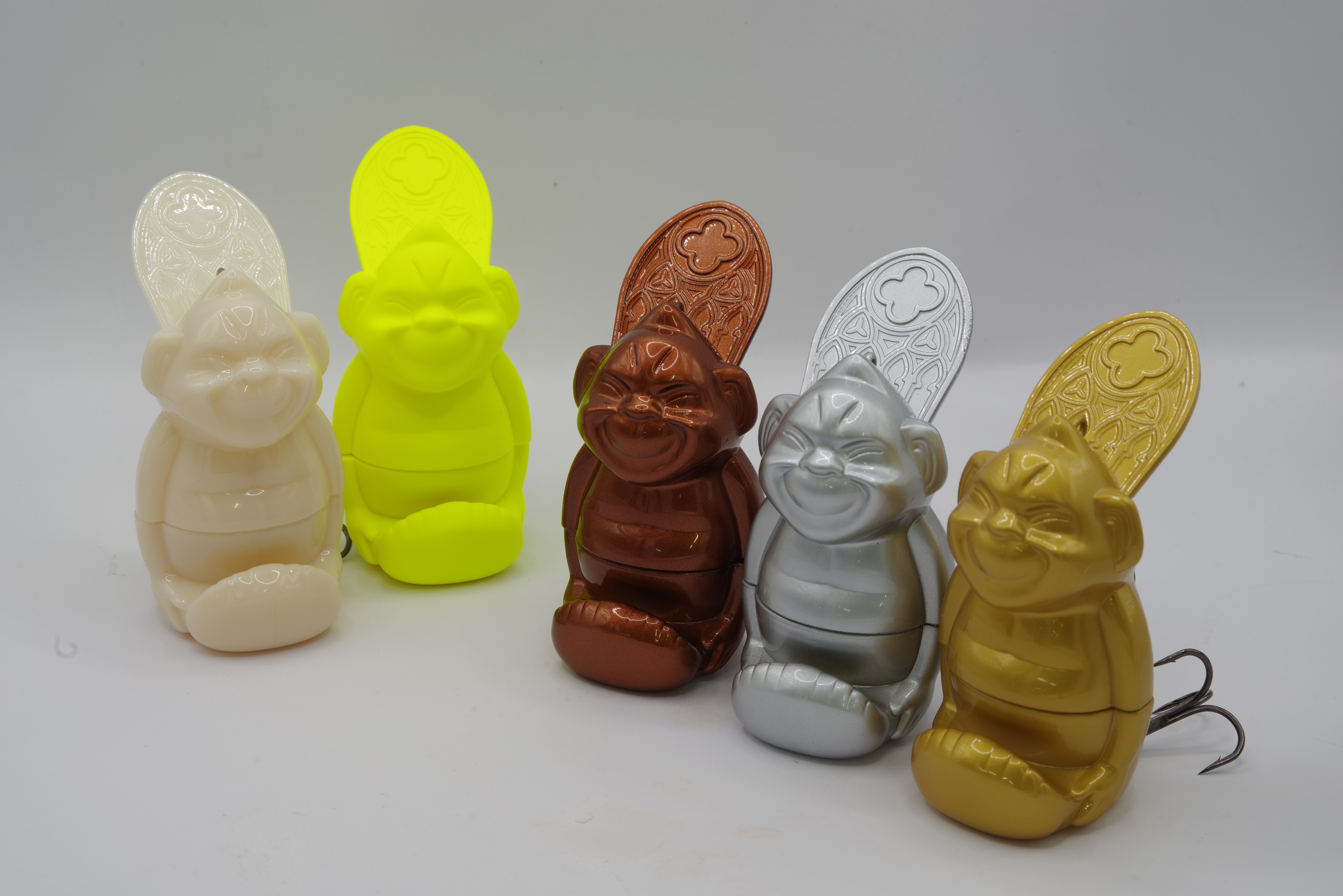 そんな“ビリケン”さんの商標権を持つ田村駒株式会社と大阪関西万博が開催される2025年に新しいプロジェクトを検討する中、deps代表であり数々の名作ルアーを生み出してきた奥村和正氏に「何か面白いことはできないか?」と持ちかけたことで奥村氏のインスピレーションが爆発。すぐさま木材を手削りしプロトルアーを作成し始めたところからビリケンルアーのプロジェクトがスタートしました。