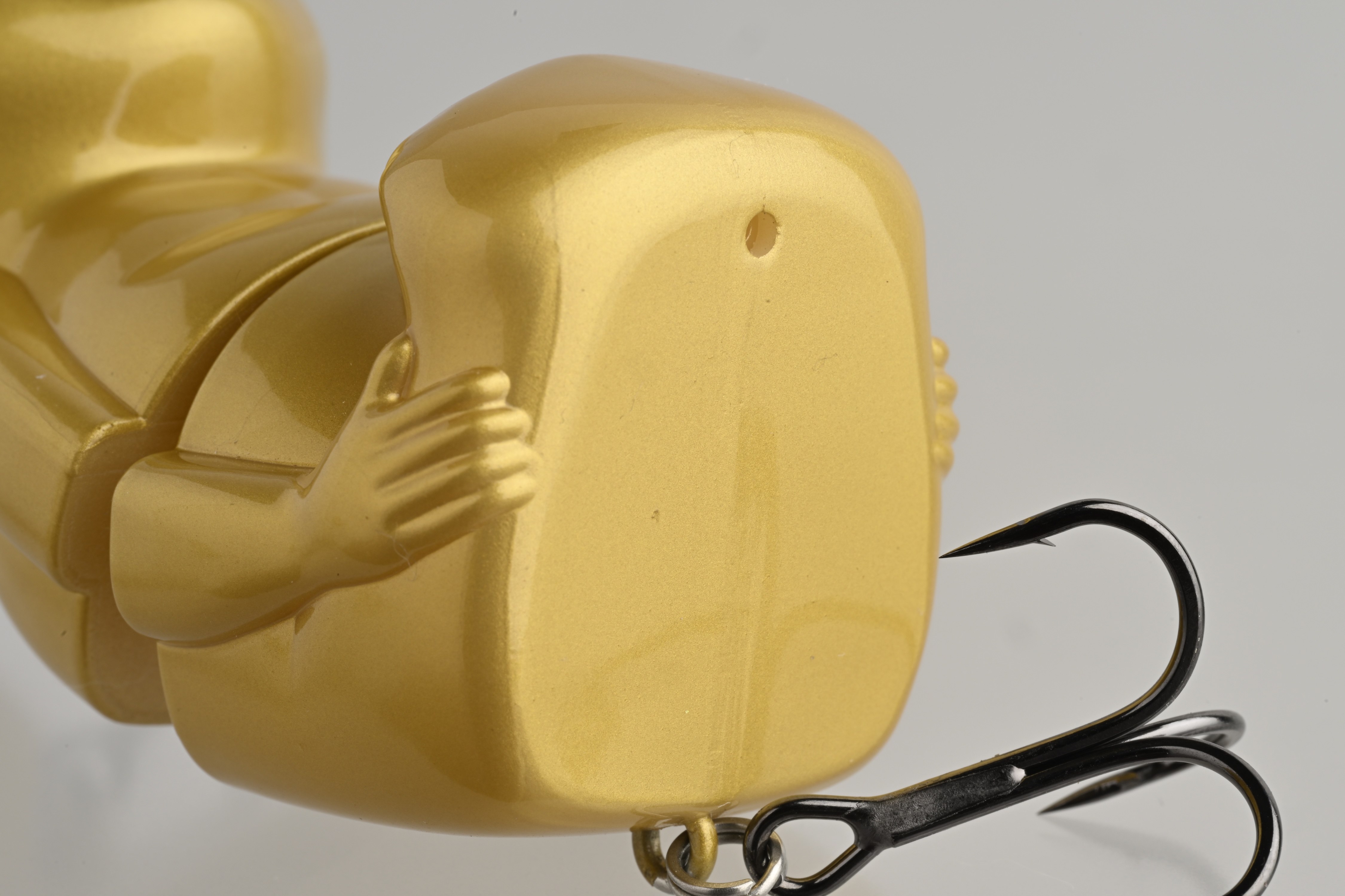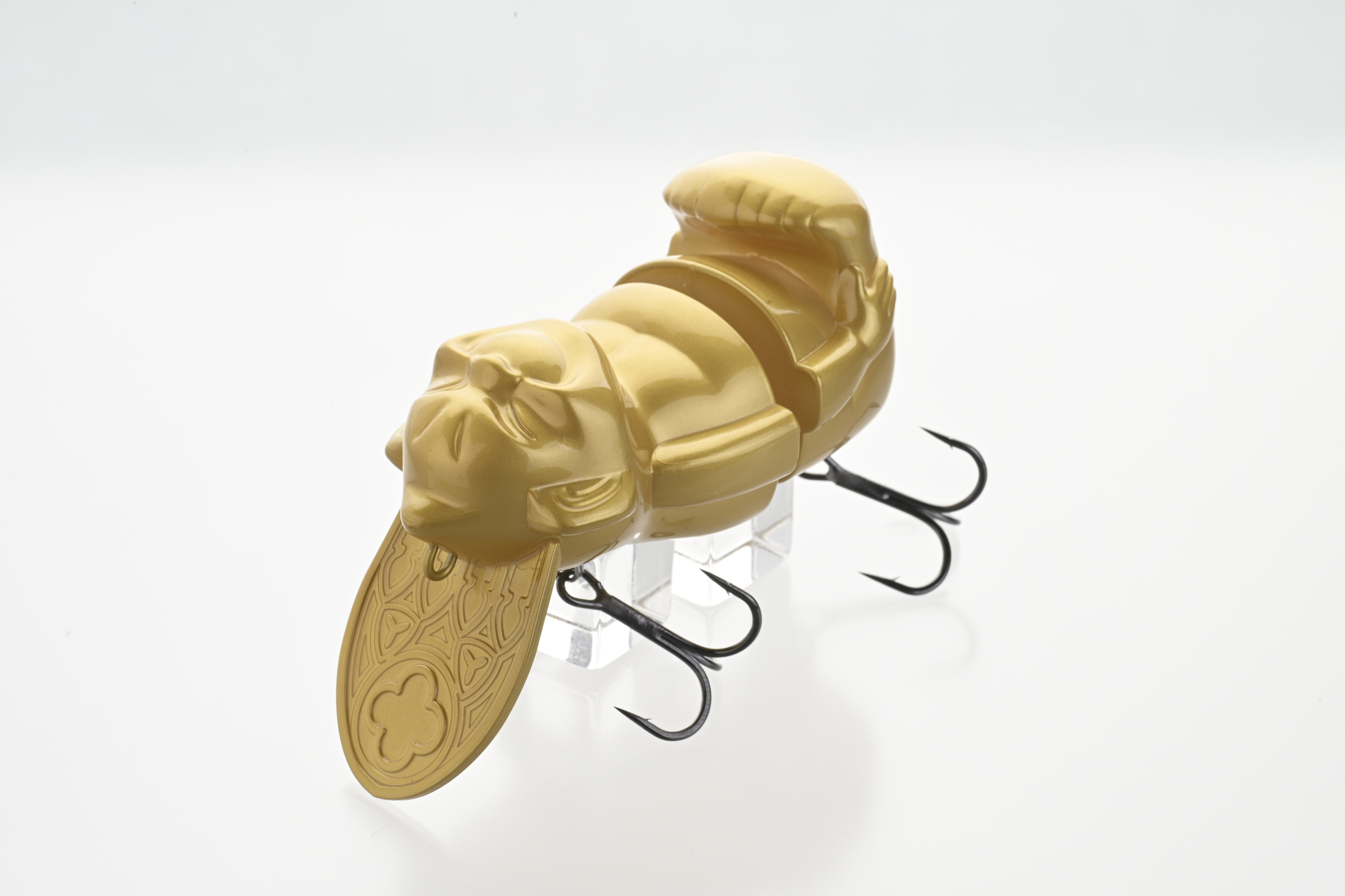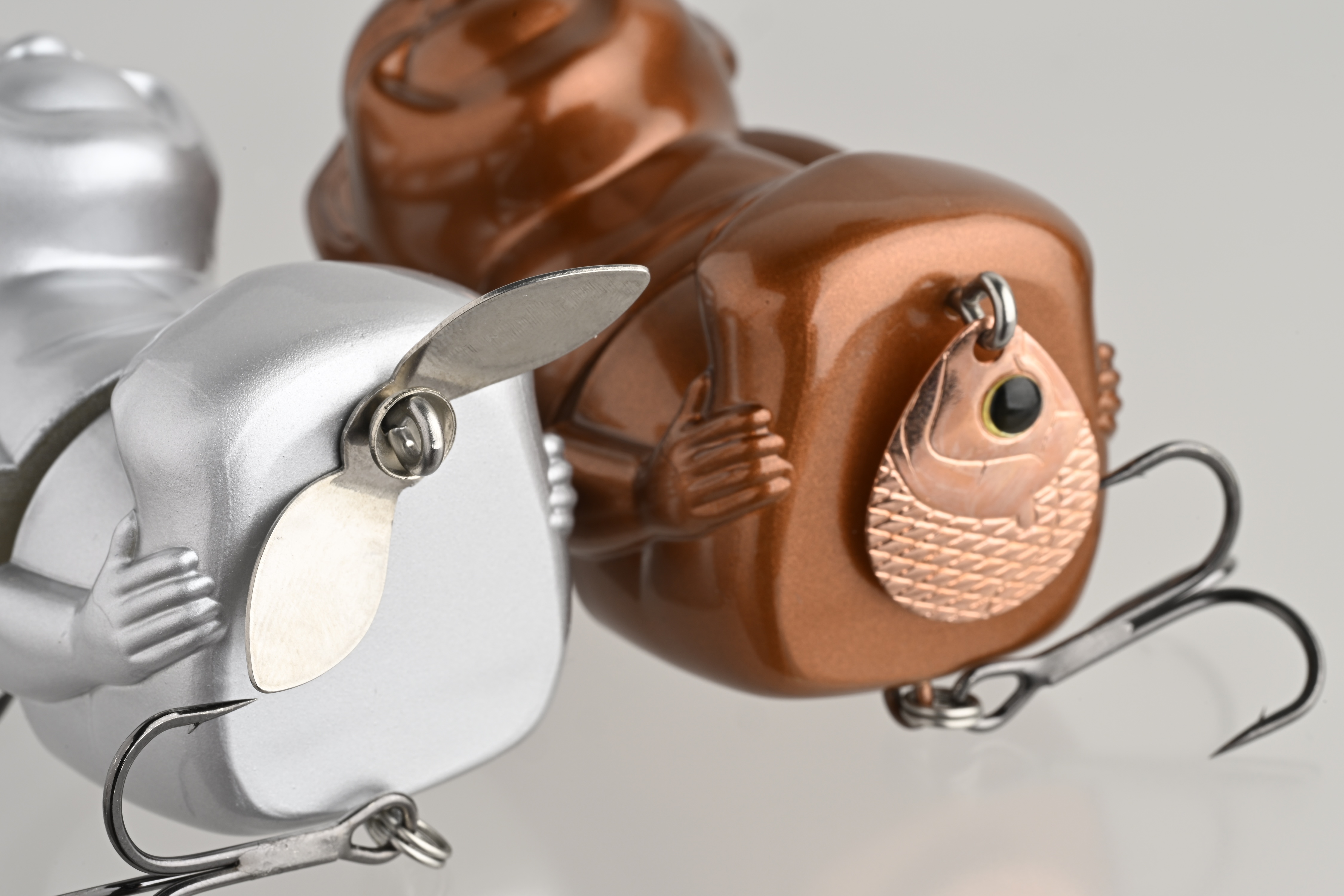 そのユーモラスな見た目から“観賞用”、“キワモノ”といった第一印象を持ちますが、実際にはルアーとして高い性能を備えています。奥村氏による度重なるテストを経て、最終製品版では高強度・高浮力のボーン素材を採用。後述するルアーの性能を最大限に引き出した設計で、ブラックバス、スモールマウスバスはもちろん、シーバスやクロダイ、ナマズ、ブラウントラウト、イトウ、はたまた沖のビッグターゲットまで幅広い魚種をターゲットに見据えています。