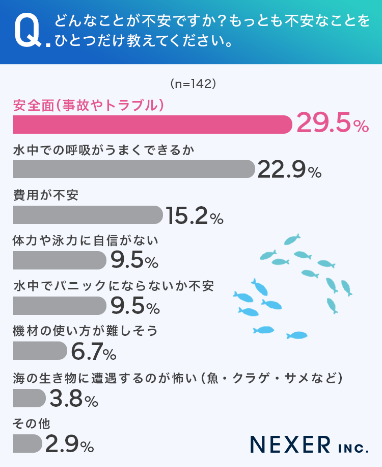 とくに「安全面」や「水中での呼吸」など命に関わることへの不安が最も高く、「費用」も大きなハードルとなっています。