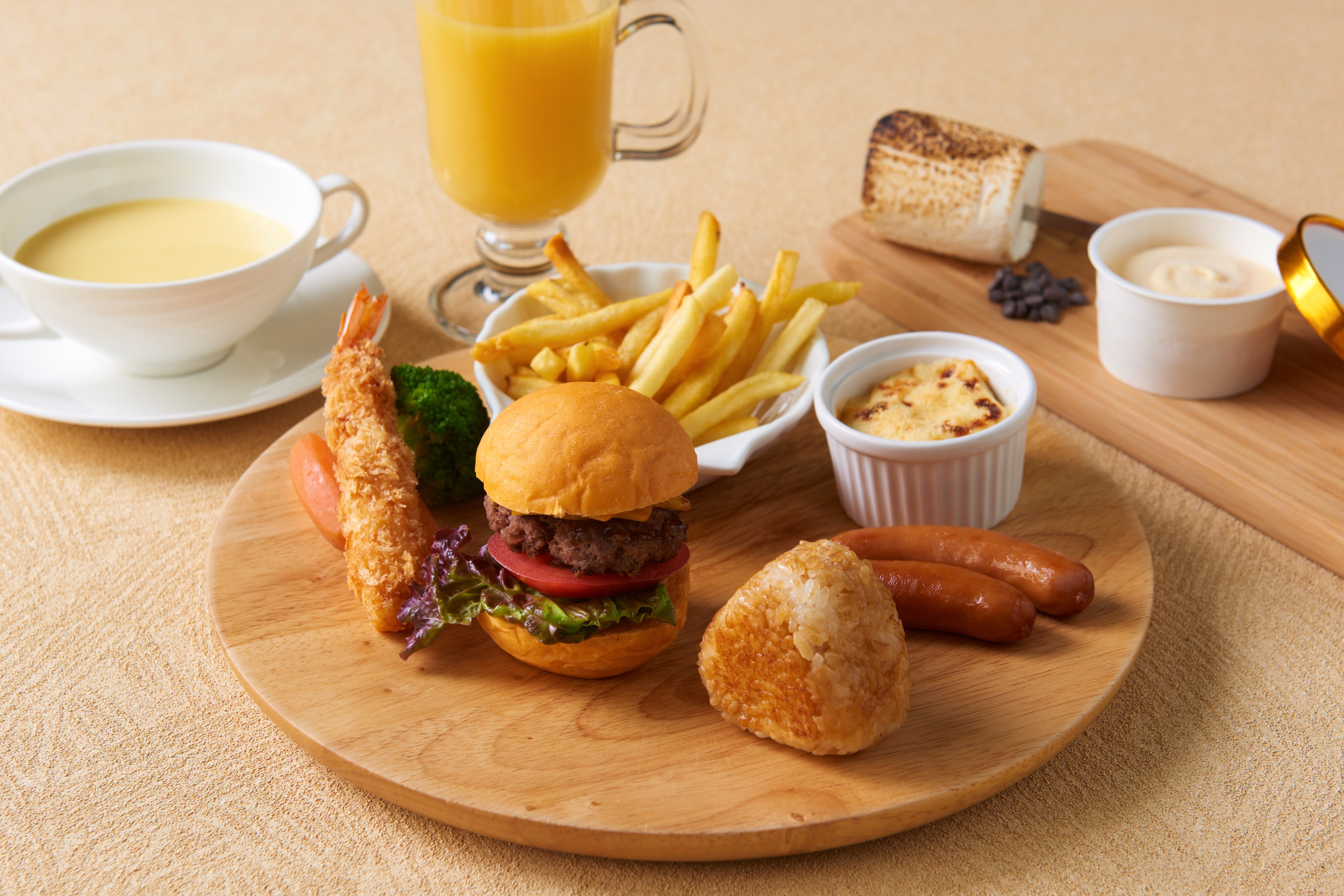 大人用のメニューに加え、小学生以下のお子さま専用の「お子さまプレート」もご用意しております。かわいいミニサイズのハンバーガーやエビフライ、ポテトにスープとまさに王道のお子さまメニューに加え、お好きなドリンクも1杯プレゼント!