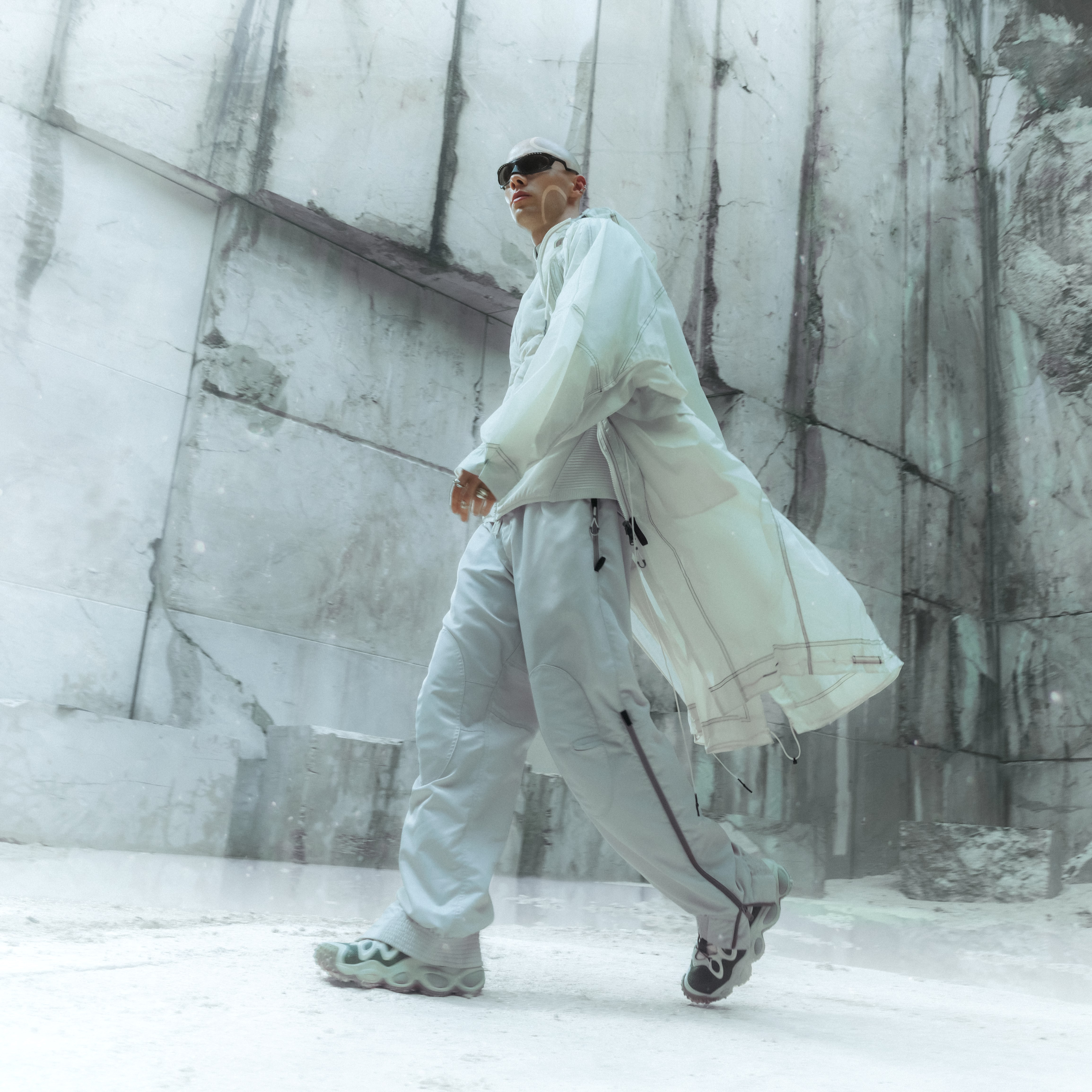 このコレクションは、パラシュート素材の強度と軽さ、耐久性と透明性のバランスを追求し、自然界の適応力を衣服に反映。独自に開発した生理形態的な設計技術であるPhysiomorphic Geometry(フィジオモルフィック ジオメトリー)に基づいたモジュラー構造により、身体の動きに追随し、変化する環境に適応する高いパフォーマンスを実現しています。