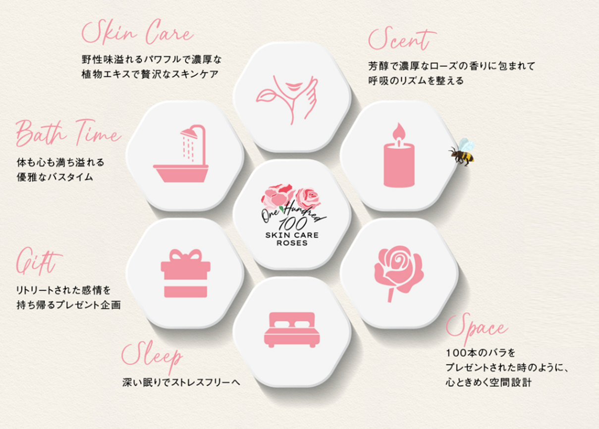 お部屋には6つのコンテンツ(体験)をご用意。お部屋を象徴する空間演出や生花を使用した演出だけでなく、日本未発売のエッセンシャルオイルの香り、そして、大人気のローズスキンケア・ボディケア商品を中心に現品を13種類贅沢に取り揃え、パワフルな植物エキスと芳醇で深みのある自然の香りを楽しめる、新たなリチュアルをご提供いたします。