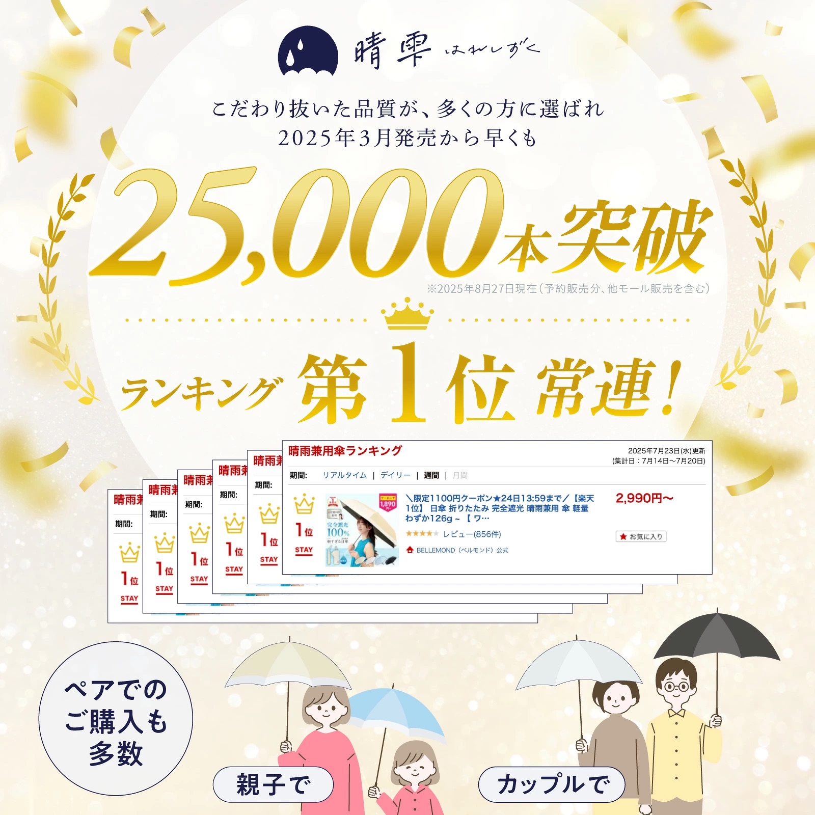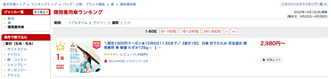 2025年10月 Fun Standard株式会社(株式会社RKB毎日ホールディングス グループ、本社:福岡県大野城市、代表取締役:大屋良介、笹森 広貴)が展開するブランド BELLEMOND(ベルモンド) の折りたたみ日傘 「晴雫(はれしずく)」 が、楽天市場の晴雨兼用傘カテゴリにおいて 週間ランキング1位を継続 していることをお知らせいたします。