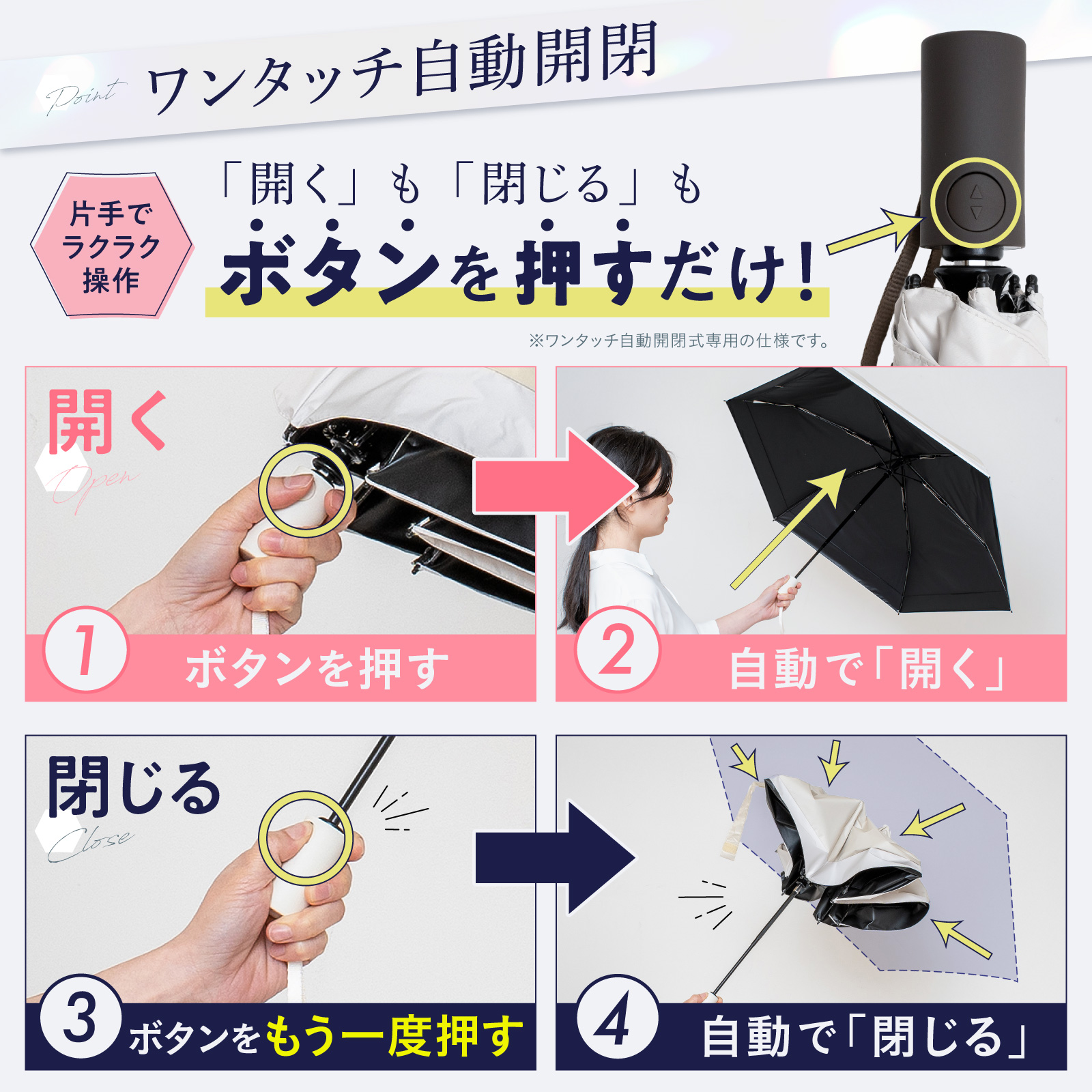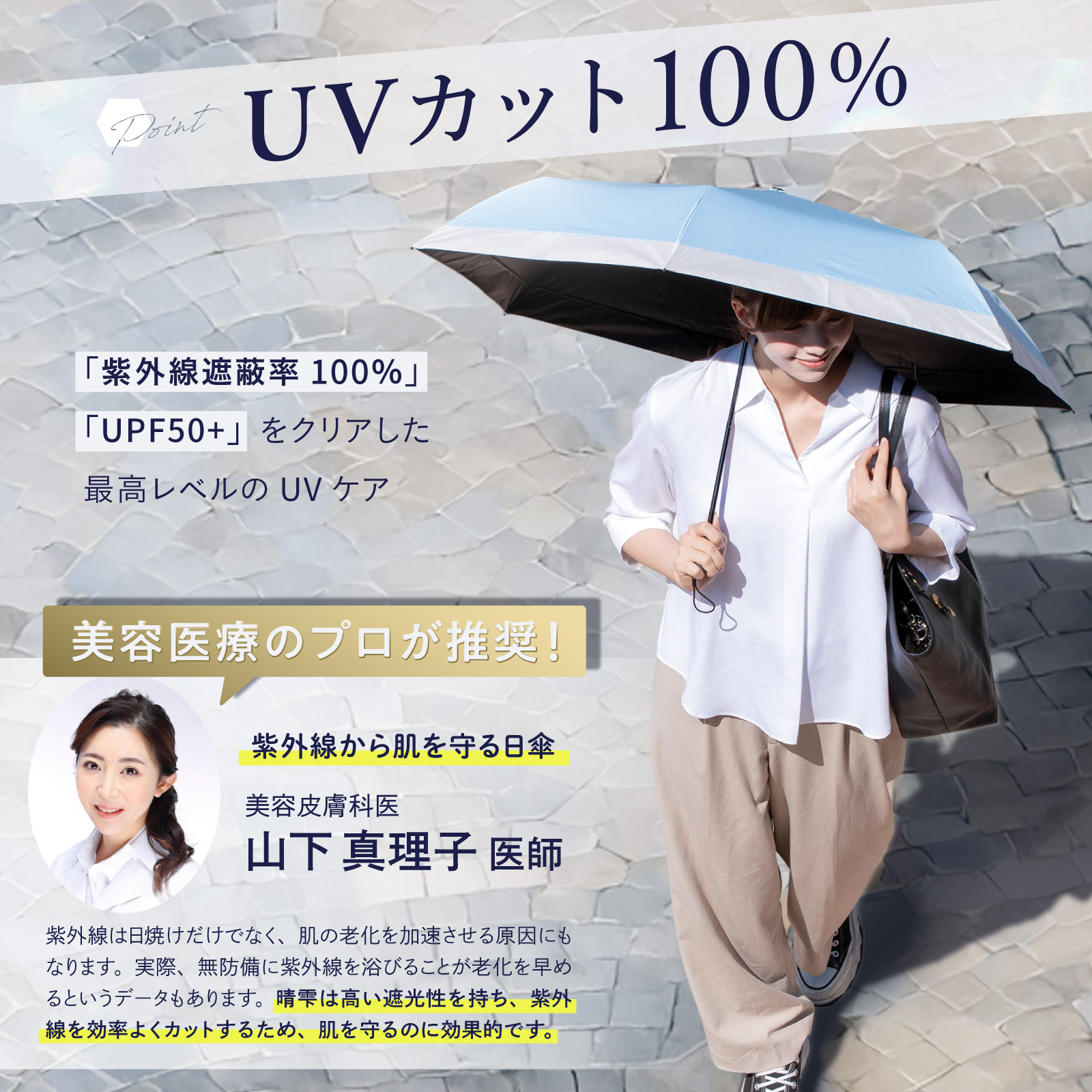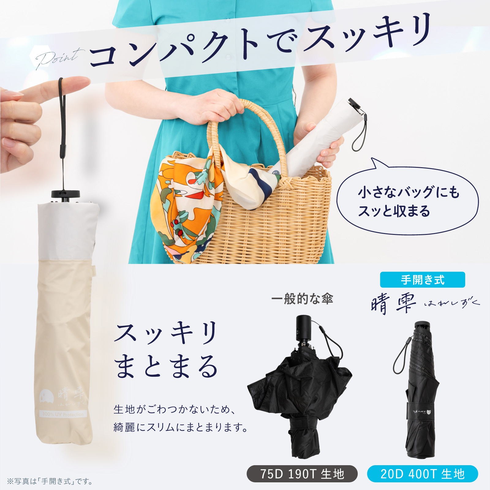 特徴:UVカット100%、完全遮光、軽量設計、吸水傘カバー付属