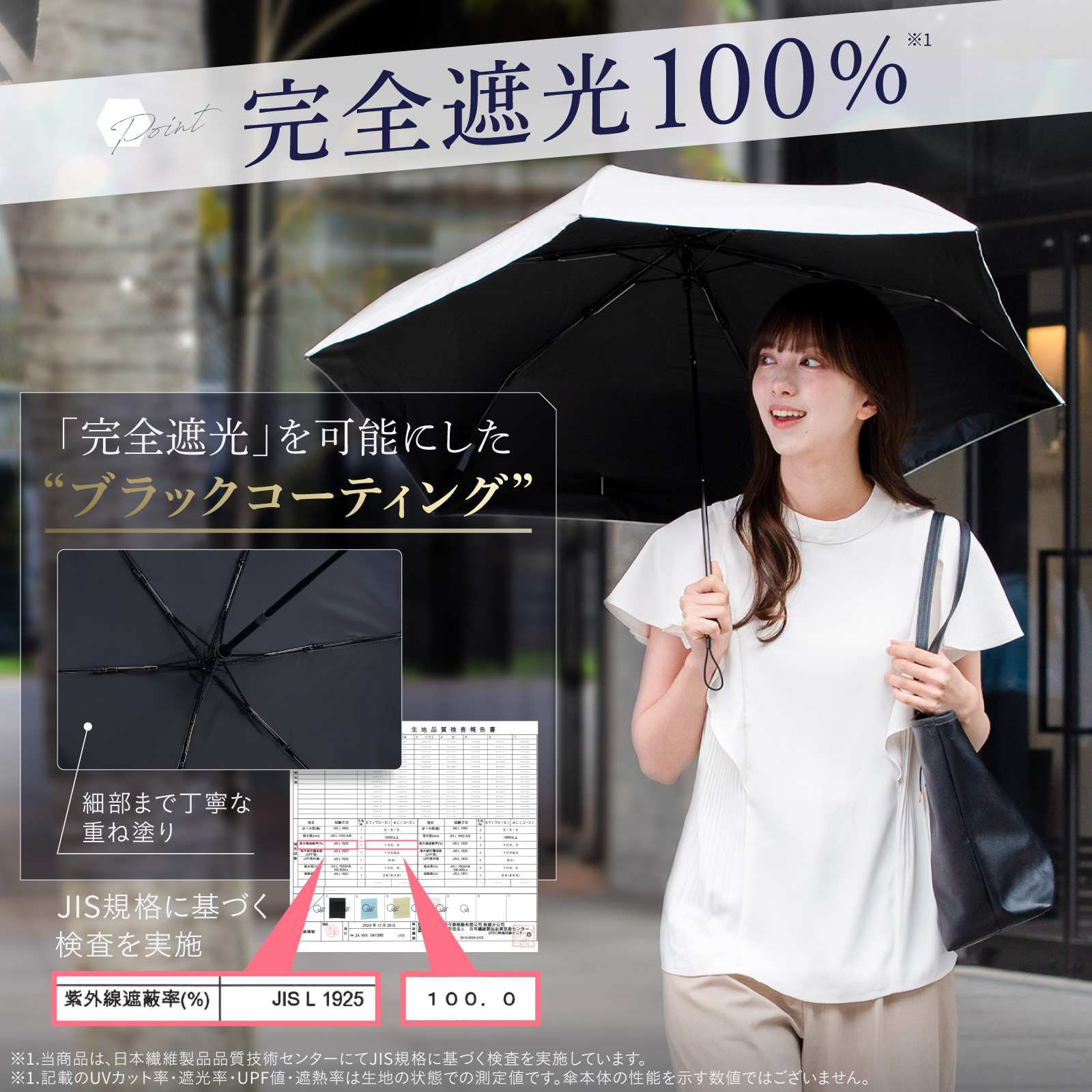 秋口の柔らかな日差しの中でも油断できない紫外線から肌を守る、UVカット率100%、遮光率100%。