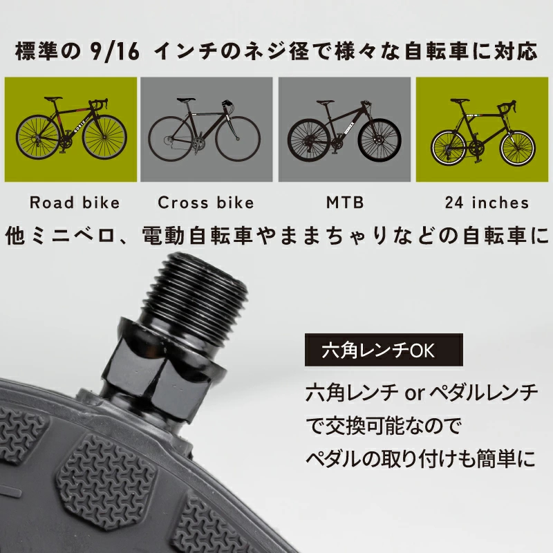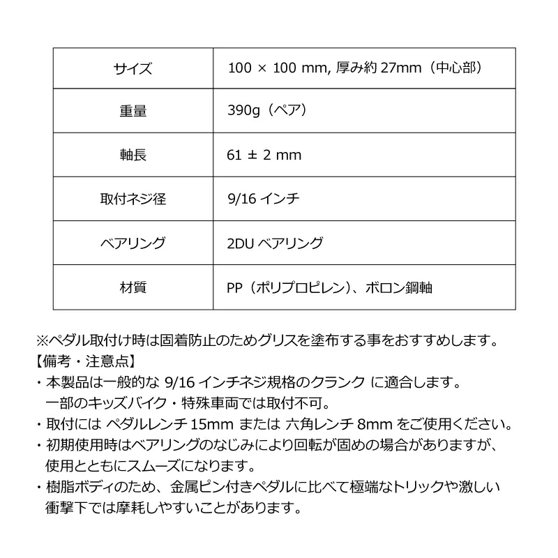 ・本製品は一般的な 9/16インチネジ規格のクランク に適合します。 → 一部のキッズバイク・特殊車両では取付不可。 ・左ペダルは逆ネジ 仕様です。取付時にはご注意ください。 ・取付には ペダルレンチ15mm または 六角レンチ8mmをご使用ください。 ・初期使用時はベアリングのなじみにより回転が固めの場合がありますが、使用とともにスムーズになります。 ・樹脂ボディのため、金属ピン付きペダルに比べて極端なトリックや激しい衝撃下では摩耗しやすいことがあります。