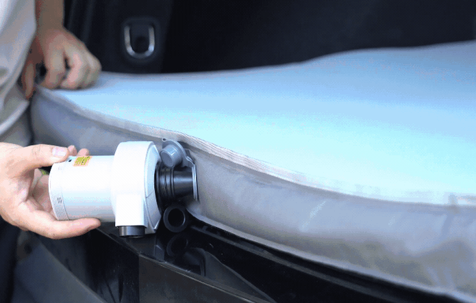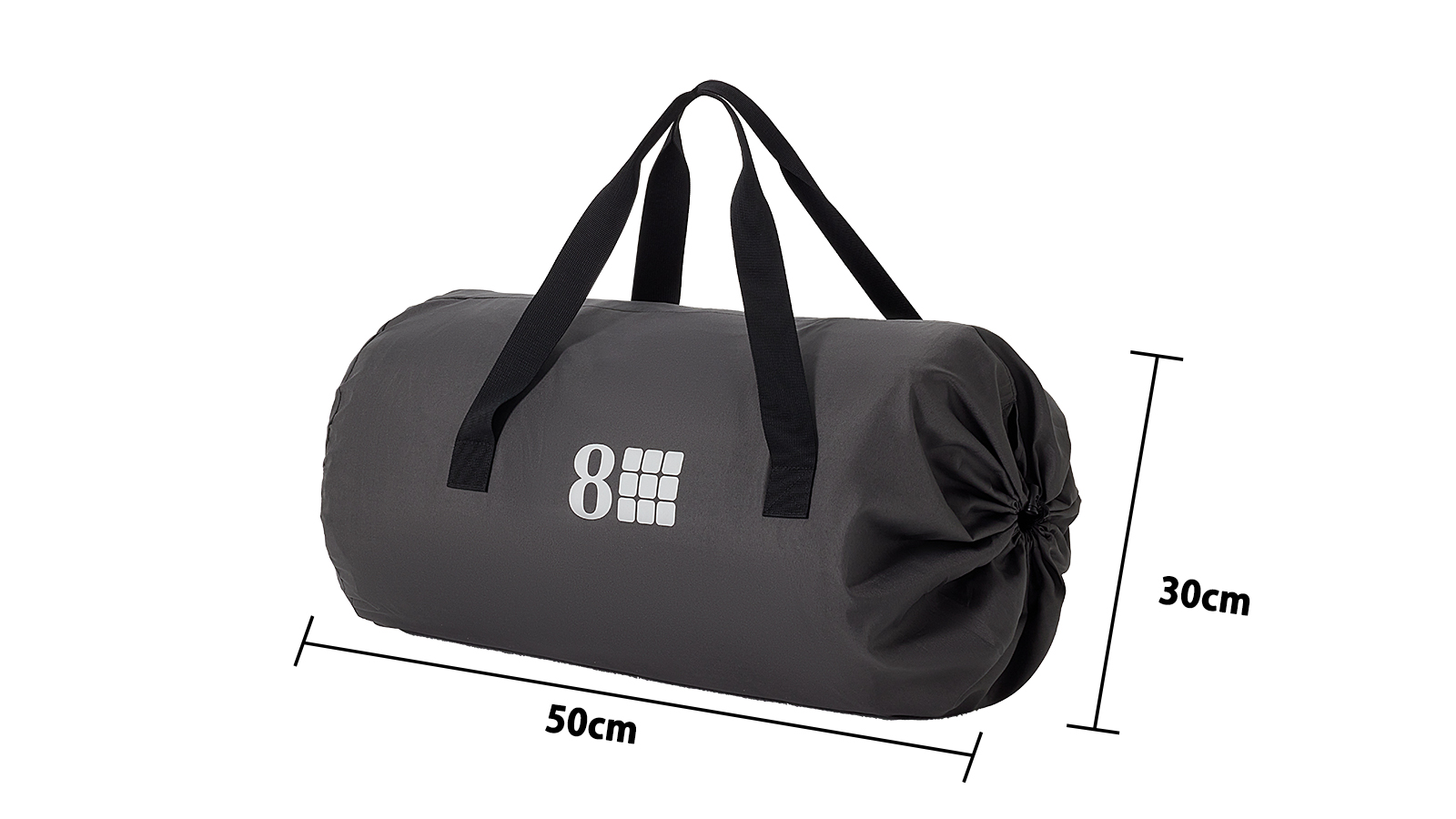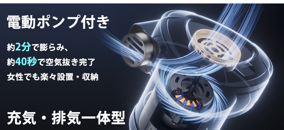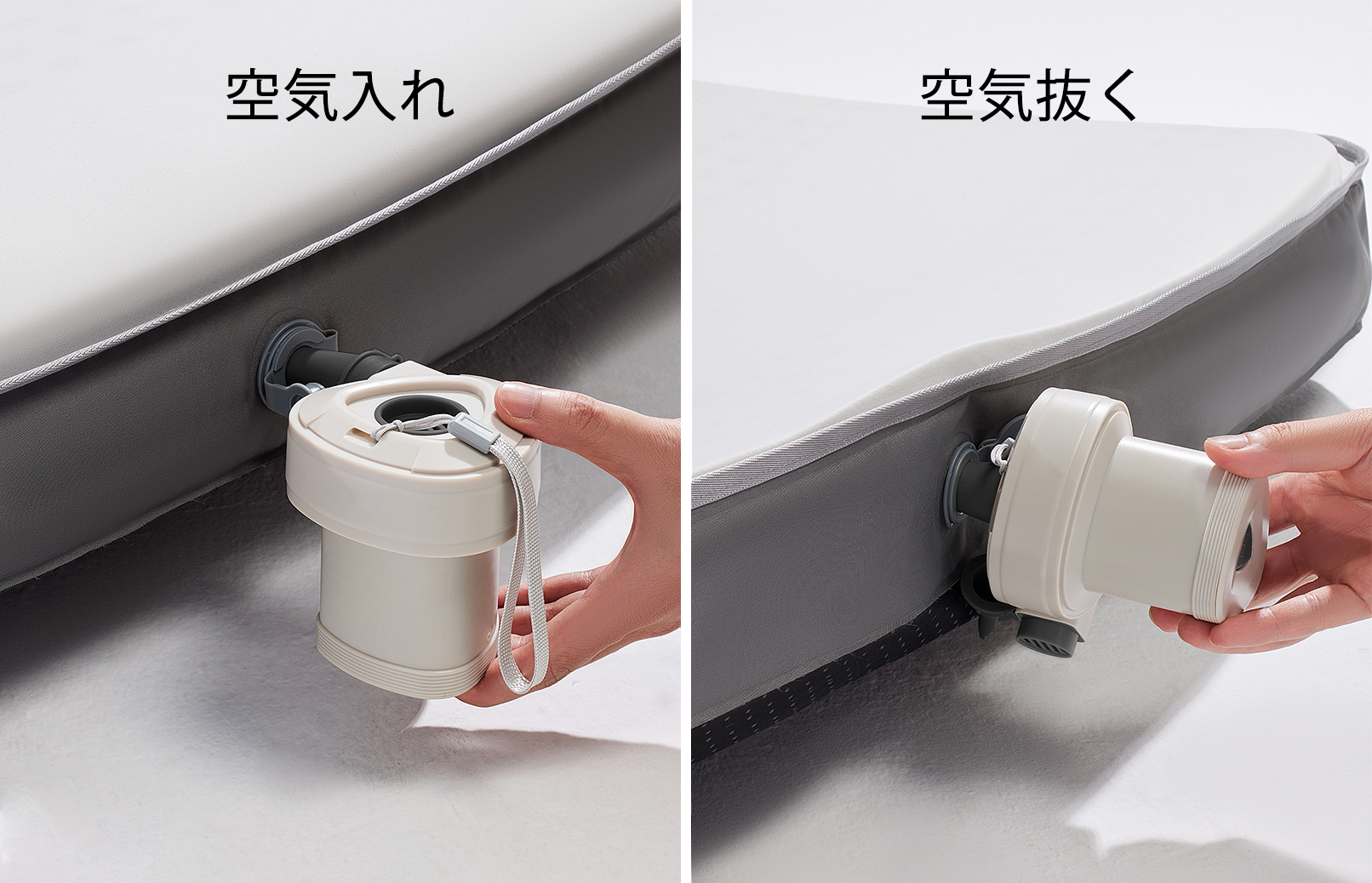8Hマットレスには、空気の充填/排出機能が一体になった高性能ポンプを標準装備。わずか約2分で膨らみ、空気抜きも約40秒で完了します。手間なくスピーディーに設置・収納が可能です。