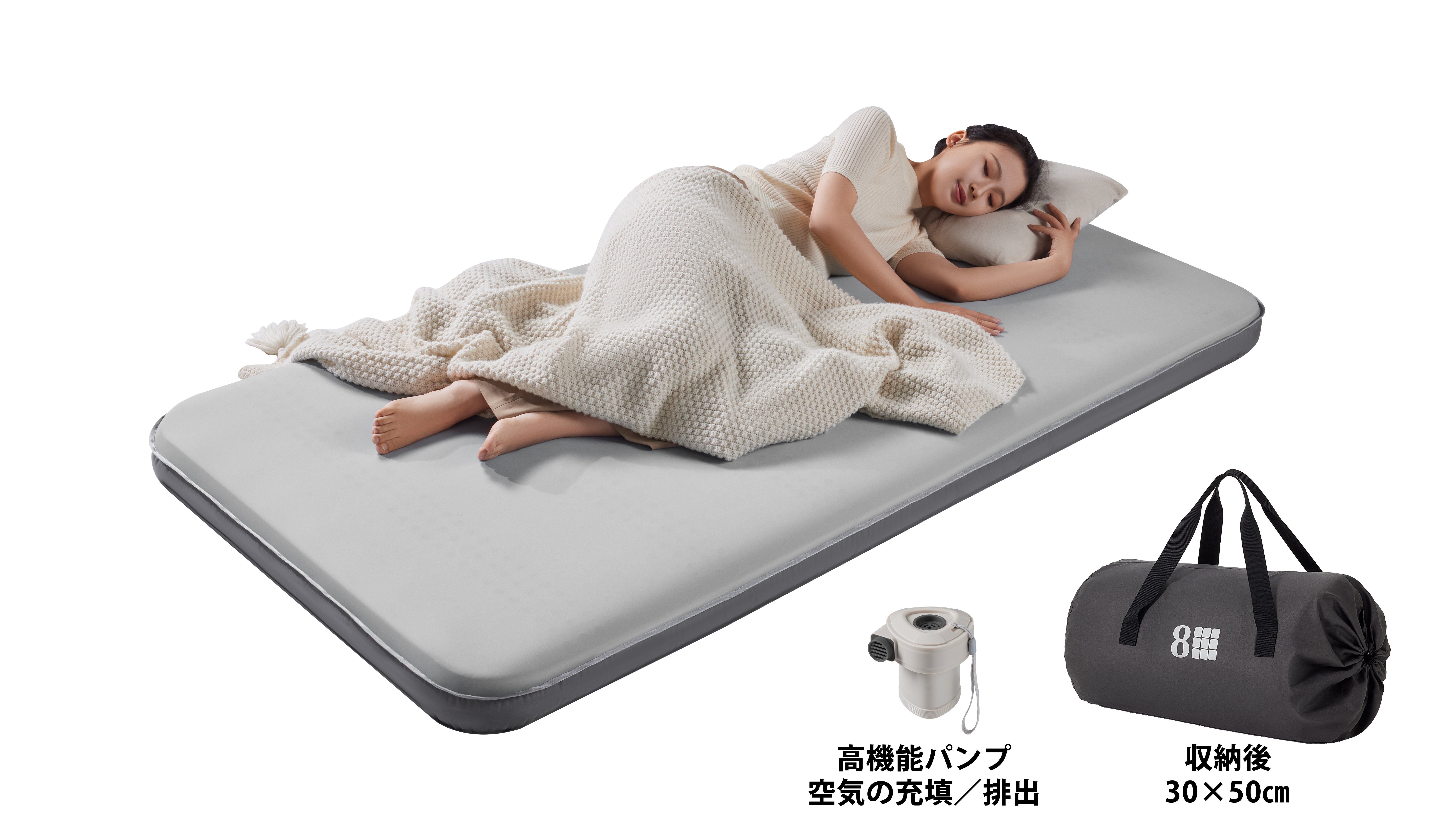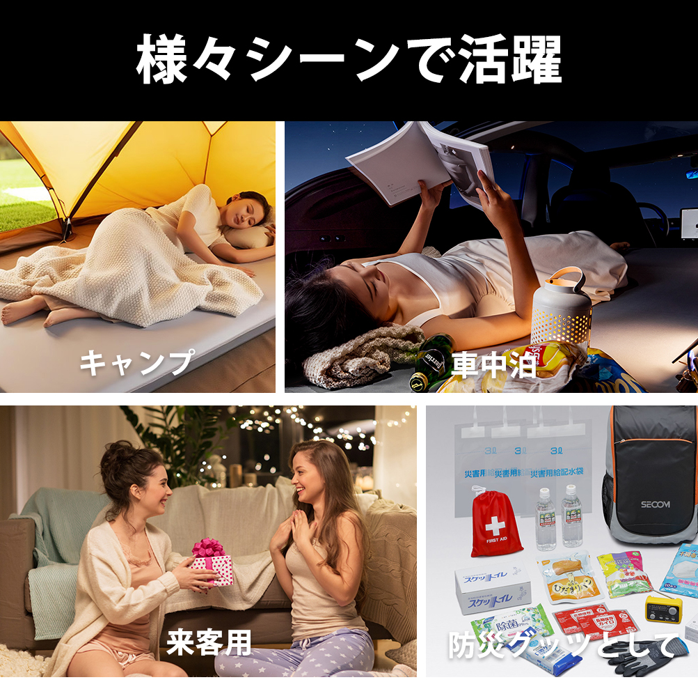 キャンプやアウトドア、急な来客、災害時の避難所など、さまざまなシーンで活躍するマットレスです。電動ポンプ付きで、わずか数分でふかふかの寝床が完成。使わないときはコンパクトに折りたたんで収納できるので、置き場所にも困りません。