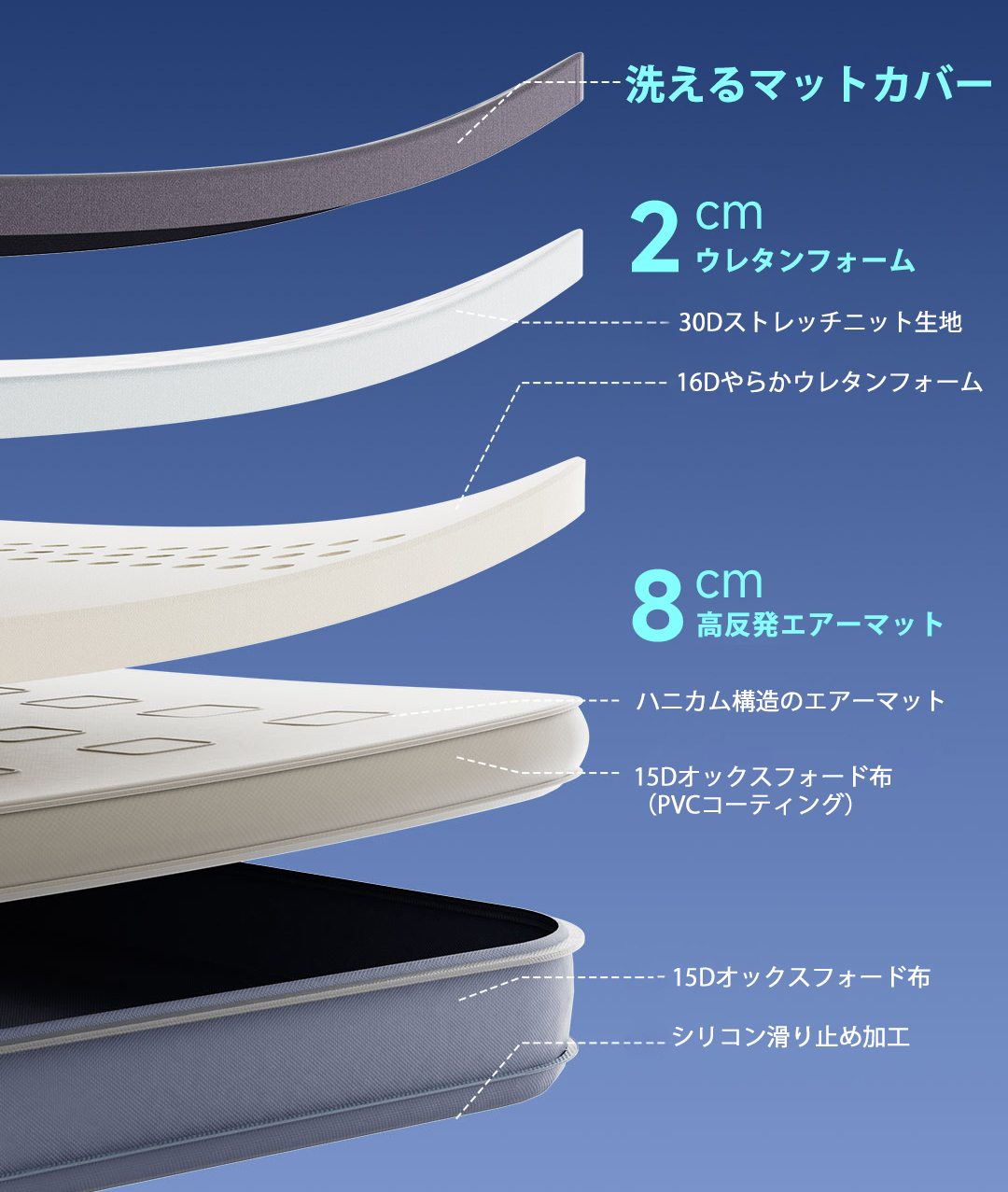 厚さ8㎝の高反発エアーマットの上に2cmのウレタンフォームを重ねることで、優れたクッション性とやわらかな肌触りを実現。