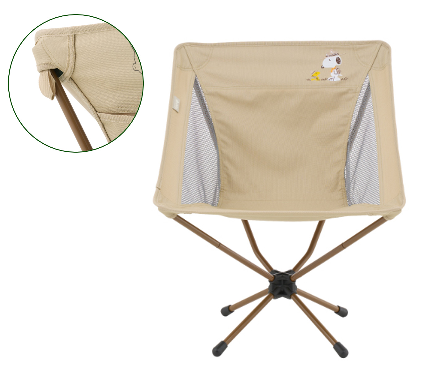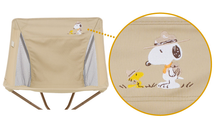 約2.2kgと軽量ながら耐荷重約150kgと頑丈で、安定感も抜群。チェアシートの上部2箇所には、指をかけるベルトが付いているため、フレーム用ポケットに差し込みやすく組立て簡単。また、シートとフレームが分解できるセパレート構造によりコンパクト収納が可能。持ち運びに便利な収納バッグは、スヌーピーがチェアに座ってくつろいでいるようなデザイン。
