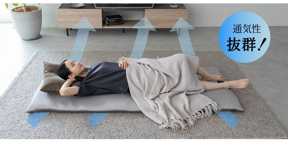表裏で硬さが異なるリバーシブル設計。厚みの違いではなく、特殊素材ダブルラッセルの密度を変えることで、硬めと柔らかめの寝心地を実現しました。通気性が良くへたりにくい素材なので、長く快適にお使いいただけます。