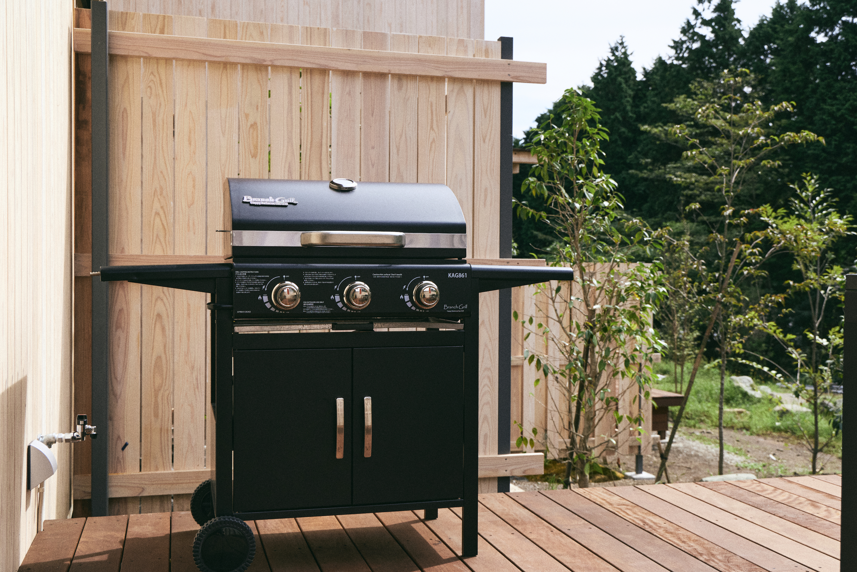 BBQグリルレンタル(5,000円/1滞在)ができるため、お好きな食材を持ち込んでデッキでBBQが可能。小田原の「長谷川ジビエ精肉店」が厳選したジビエや地元野菜を楽しめるBBQセット(11,000円/1名様 ※グリルレンタル含む)も承ります。お肉は塊肉で、野菜はまるまるとじっくり焼き上げることで、味わい深いBBQをお楽しみいただけます。
