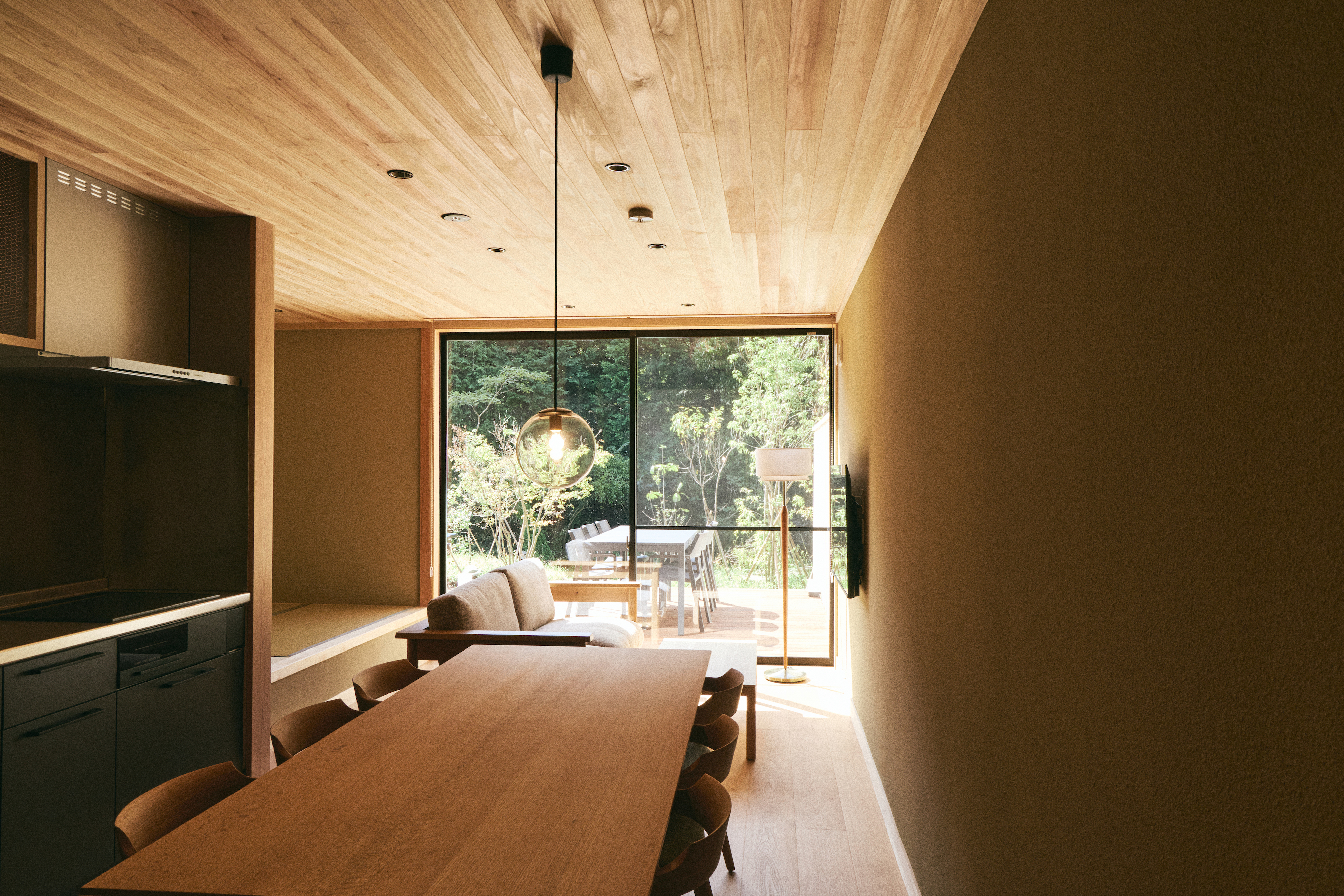 Fumihiko Sano Studioが手がける木造建築ネイチャーアクティビティのほか、温泉、プライベートサウナ、素材を丸ごと楽しむジビエBBQなどを提供