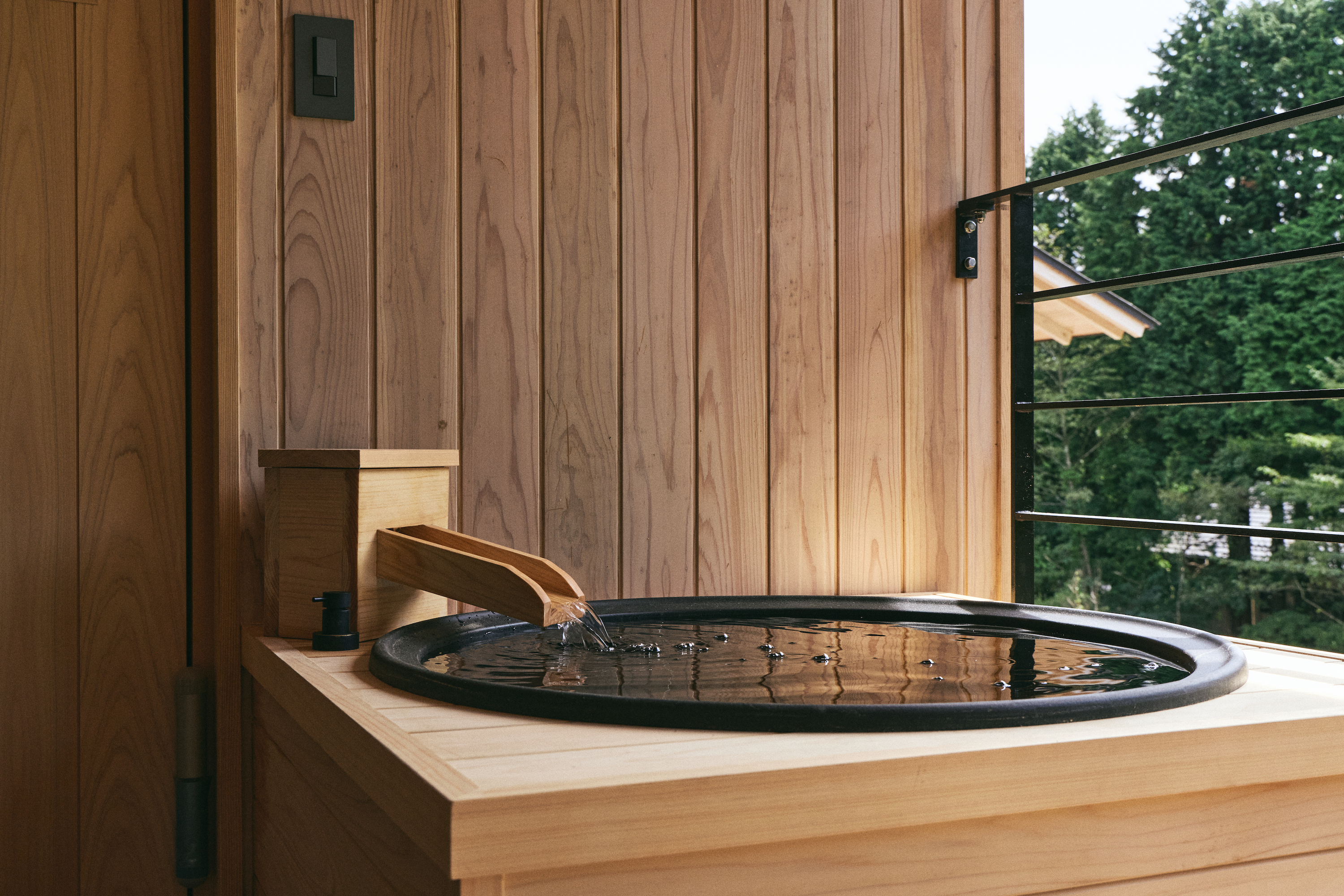 全客室の2Fにプライベートサウナ、水風呂、そして外気浴ができるテラスをご用意。アカデミックサウナレーベル『madsaunist(マッドサウニスト)』が開発したクナイプ(水療法)と呼吸法を掛け合わせた、サウナ内でクールダウンを行うヒューマンロウリュなど、科学的根拠に基づいたサウナも提供します。