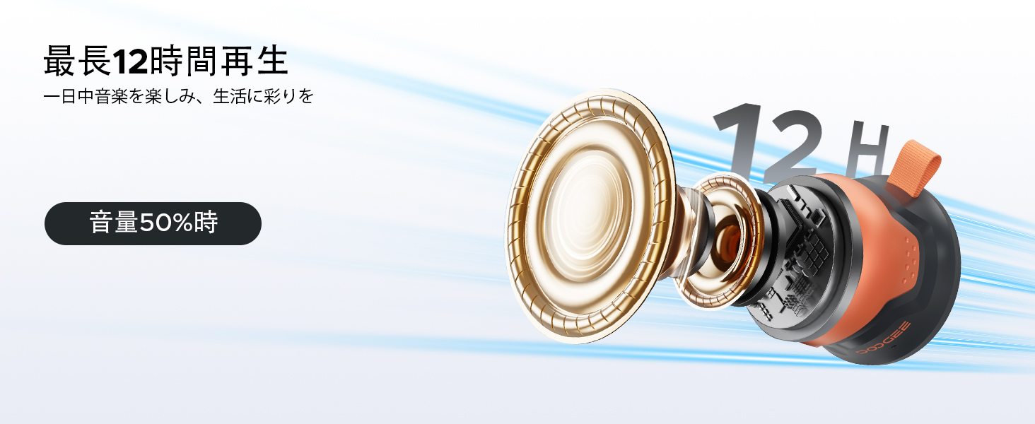 700mAhバッテリーにより、50%音量時で最大12時間の連続再生が可能。旅行、パーティー、ピクニックなど、長時間のアクティビティでも音楽が途切れません。