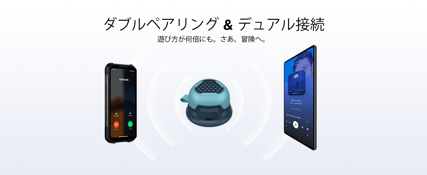 本体は手のひらサイズながら、φ40.5mmの大型ドライバーを搭載し、音の輪郭がくっきりとした立体的なサウンドを再生。IP66の防水防塵性能と1.5m耐衝撃設計により、海辺やキャンプ場、バスルームなど、あらゆる環境で安心して使用できます。