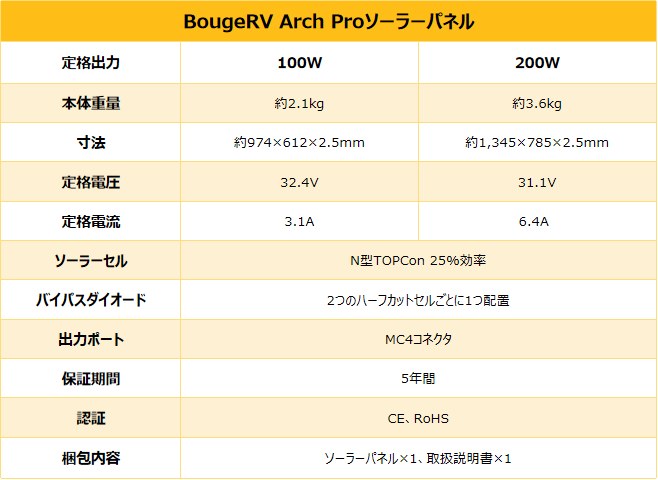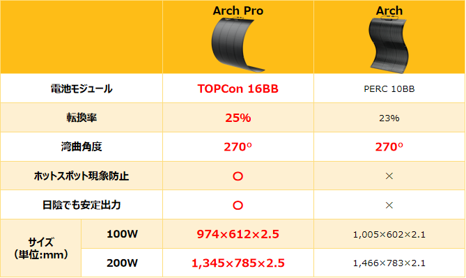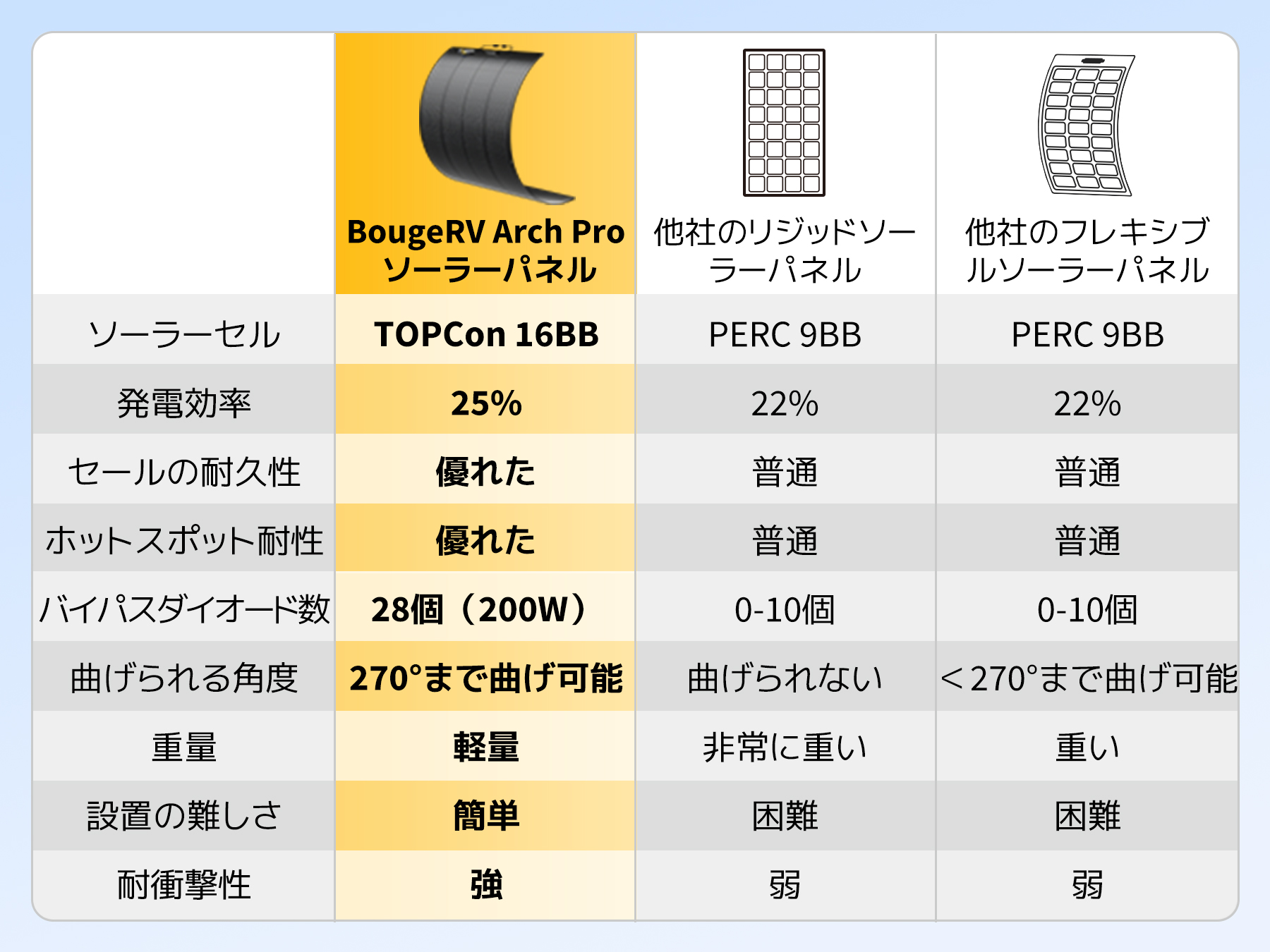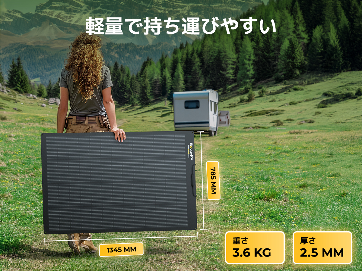 世界初の200W単結晶フレキシブルソーラーパネル(バイパスダイオード搭載)として、次世代技術を採用した高効率ソーラーパネルであり、アウトドアから防災まで幅広いシーンで活躍します。業界トップクラスの25%発電効率を誇り、影がある環境下でも安定した電力供給を実現するなど、これまでの常識を超える性能を備えています。