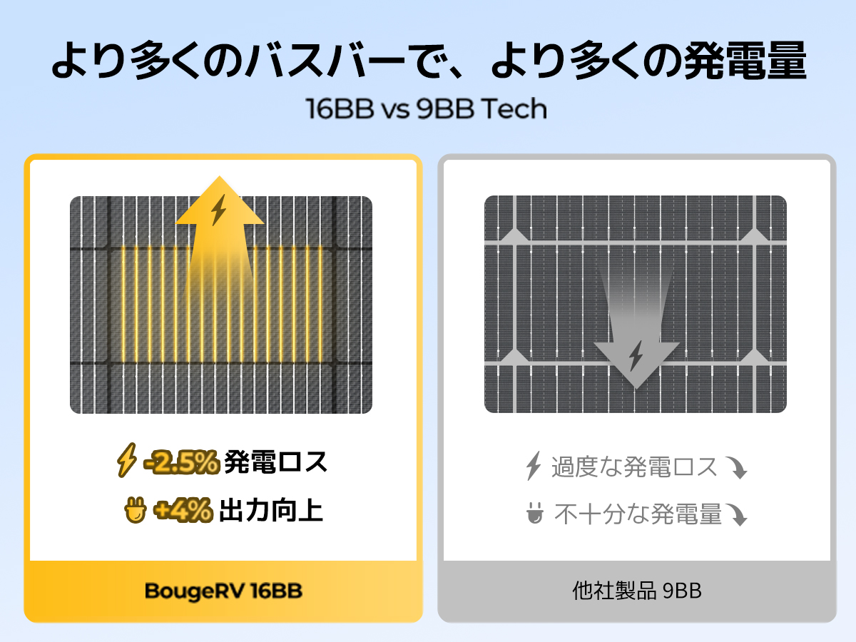 従来の9バスバーに比べ、電流経路を増やした16バスバー先進設計を採用。抵抗を分散し発電ロスを大幅に低減、安定した高効率発電を実現します。