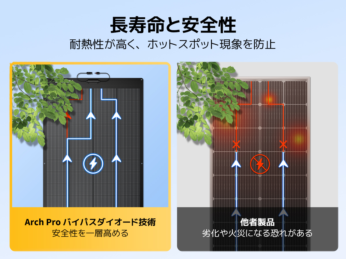 高い耐熱性によりホットスポット現象を防止し、パネルの劣化を抑制。長寿命と安全性を兼ね備え、安心して長期間使用できる。