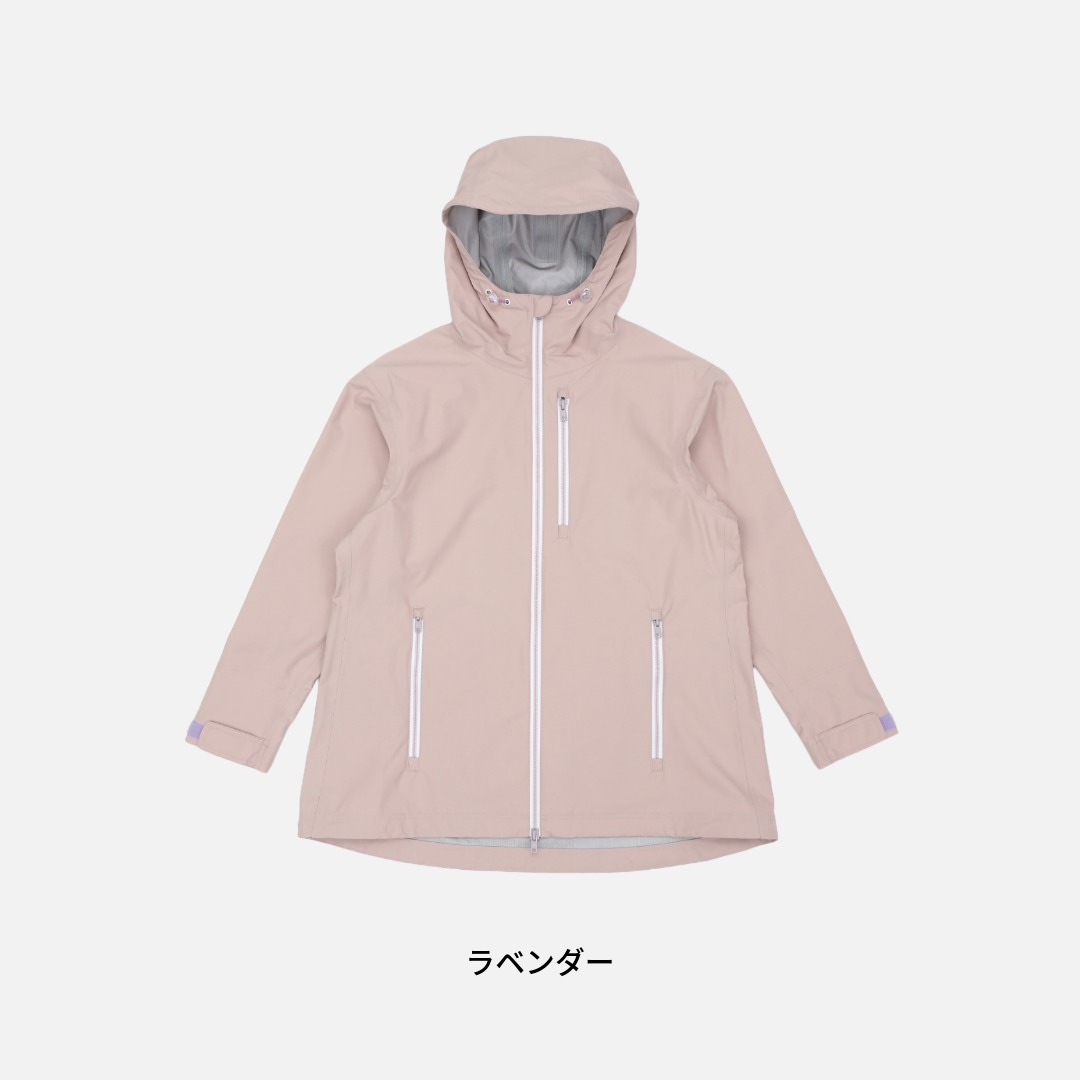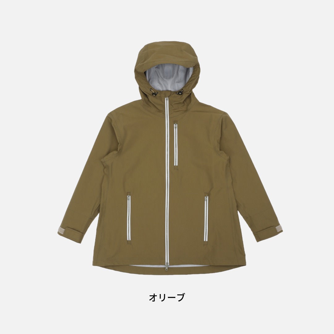 コットンライクな軽量タスランタフタをベースに特殊ウレタン透湿フィルムをラミネートした3層構造素材を使用。薄手で軽量、女性の体に最適なパターンメイキングにより釣りの動きを妨げることがありません。