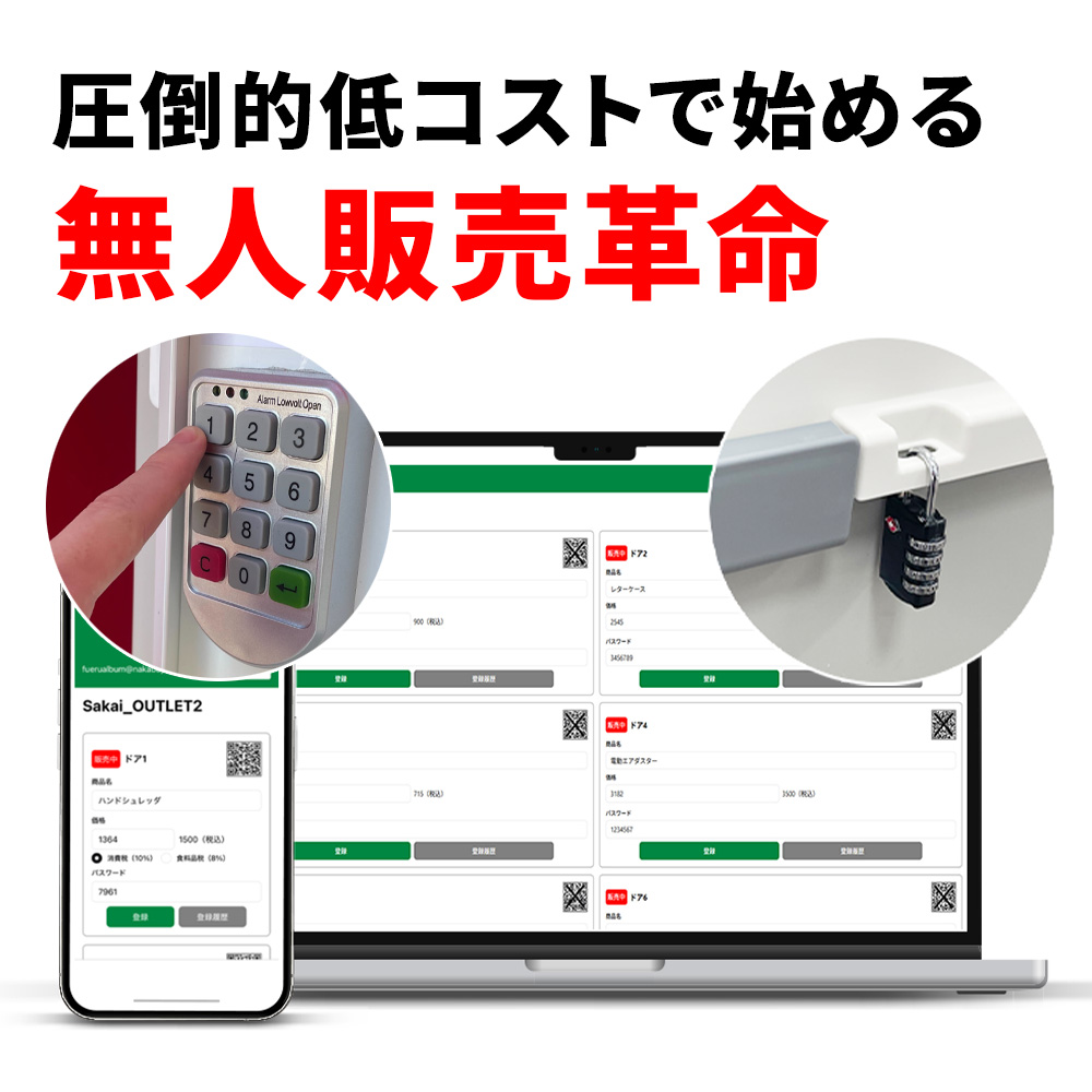 「無人販売システム」は、電源不要・低コストで導入可能な革新的ソリューションです。QRコード決済と暗証番号による解錠でロッカーやBOXがそのまま無人販売機に変身。