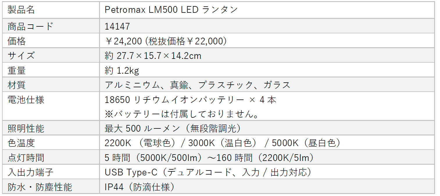 灯油ランタン「HK500」の伝統的フォルムを継承しながら、LEDの先進性をまとった本製品は、最大500lmの無段階調光、3段階の色温度切替え、防滴性能、USB-C給電/出力機能など、現代アウトドアに必要なスペックを多数搭載。