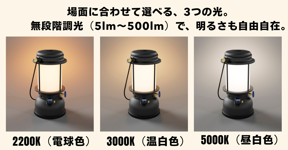 最大500ルーメンの明るさは、無段階に調整可能。暖かく揺らめくような2200K(電球色)、リラックス感のある3000K(温白色)、そして実用的な5000K(昼白色)と、3段階の色温度切替えに対応。