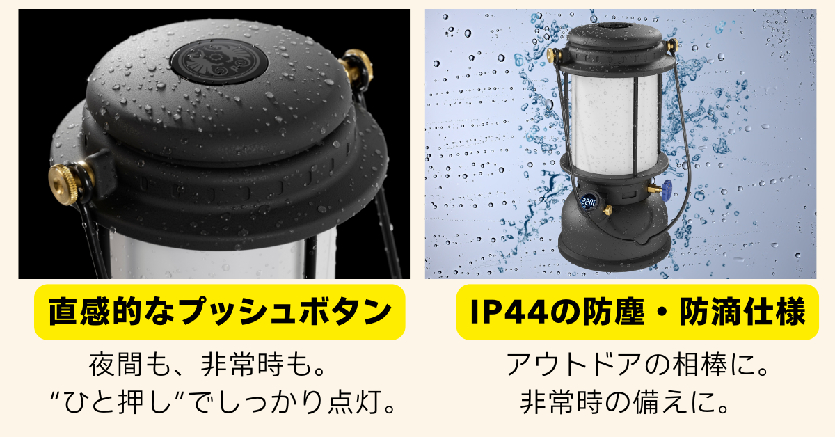 トップのプッシュボタンを1秒押すだけの簡単操作で点灯。IP44準拠の防滴仕様により、突然の雨や湿気にも対応し、屋外・室内問わず安心して使用できます。