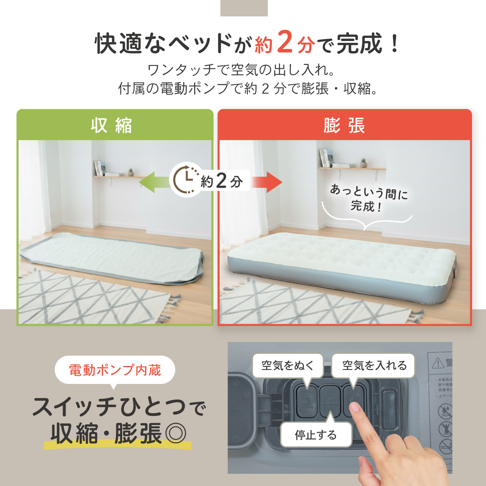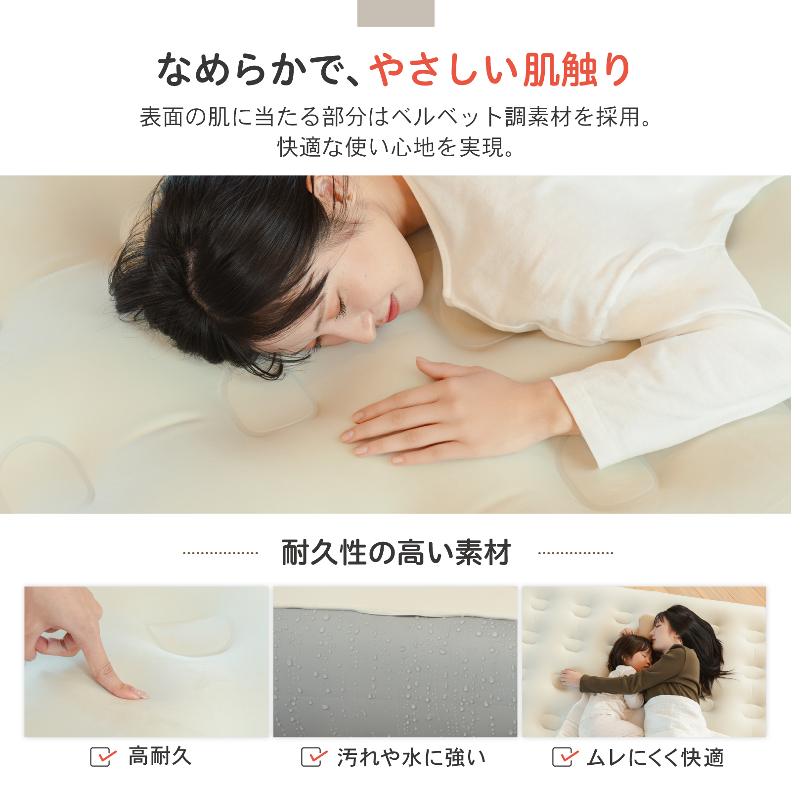 本製品は、スイッチひとつで簡単に設置でき、コンセント不要で、いつでもどこでも快適な睡眠環境を提供するエアーベッドです。一台あれば来客用・車中泊・アウトドア・非常時などさまざまなシーンで幅広く活躍します。