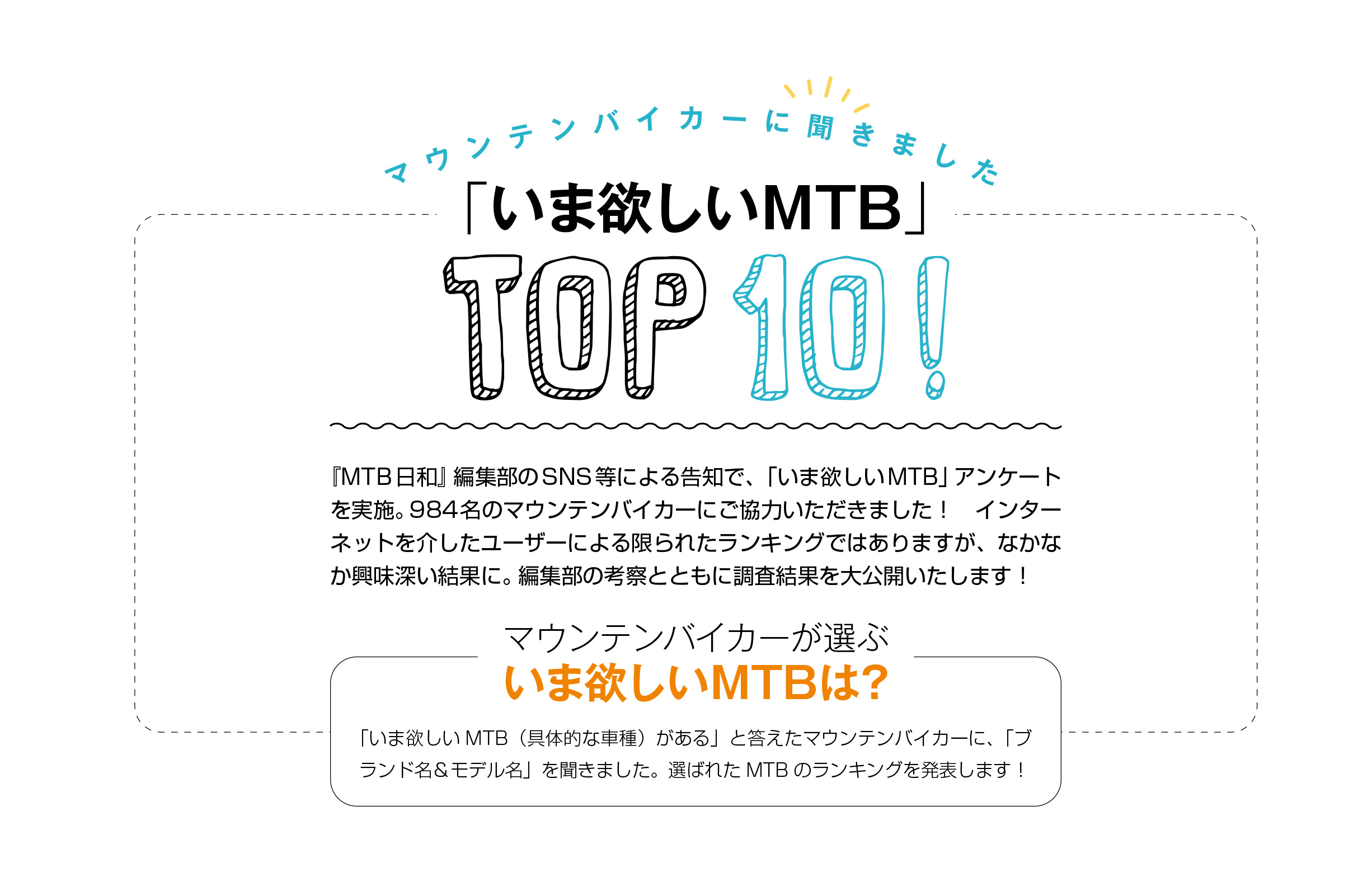 『MTB日和』編集部のSNS等による告知で、「いま欲しいMTB」アンケートを実施。インターネットを介したユーザーによる限られたランキングではありますが、なかなか興味深い結果に。編集部の考察とともに調査結果を大公開いたします!