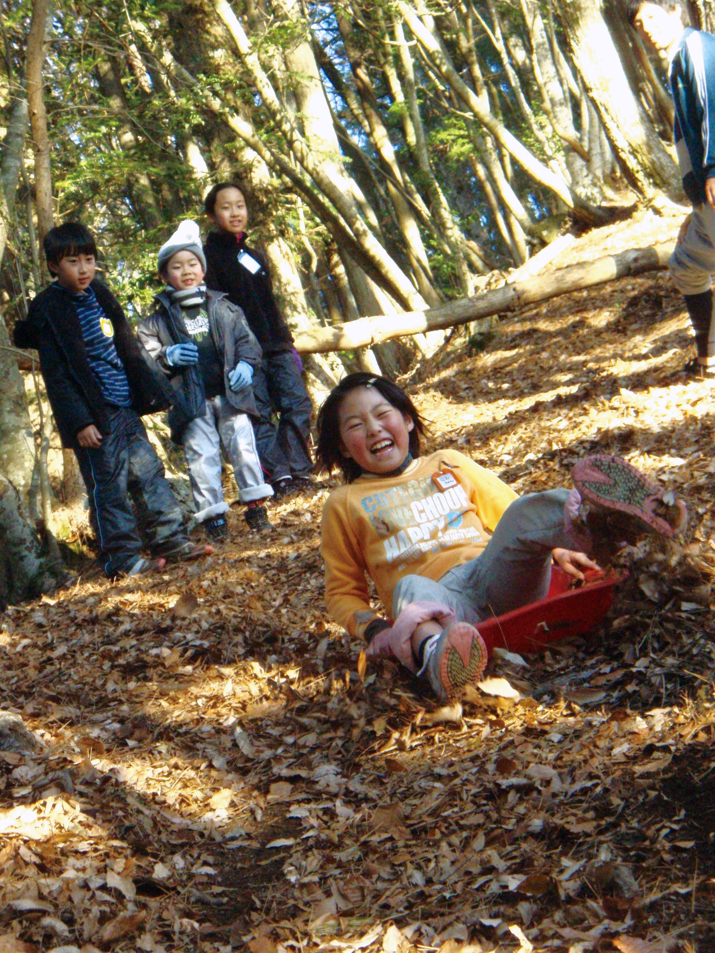 冬の信州こども山賊キャンプは、信州の里山や森で「食う・寝る・遊ぶ・働く」を体験するキャンプ。落ち葉の斜面でソリ滑りしたり、山に登って眺めを楽しんだり…!五感をフルに使う里山での遊びや暮らしは、こどもたちの心も体も健やかになっていきます。