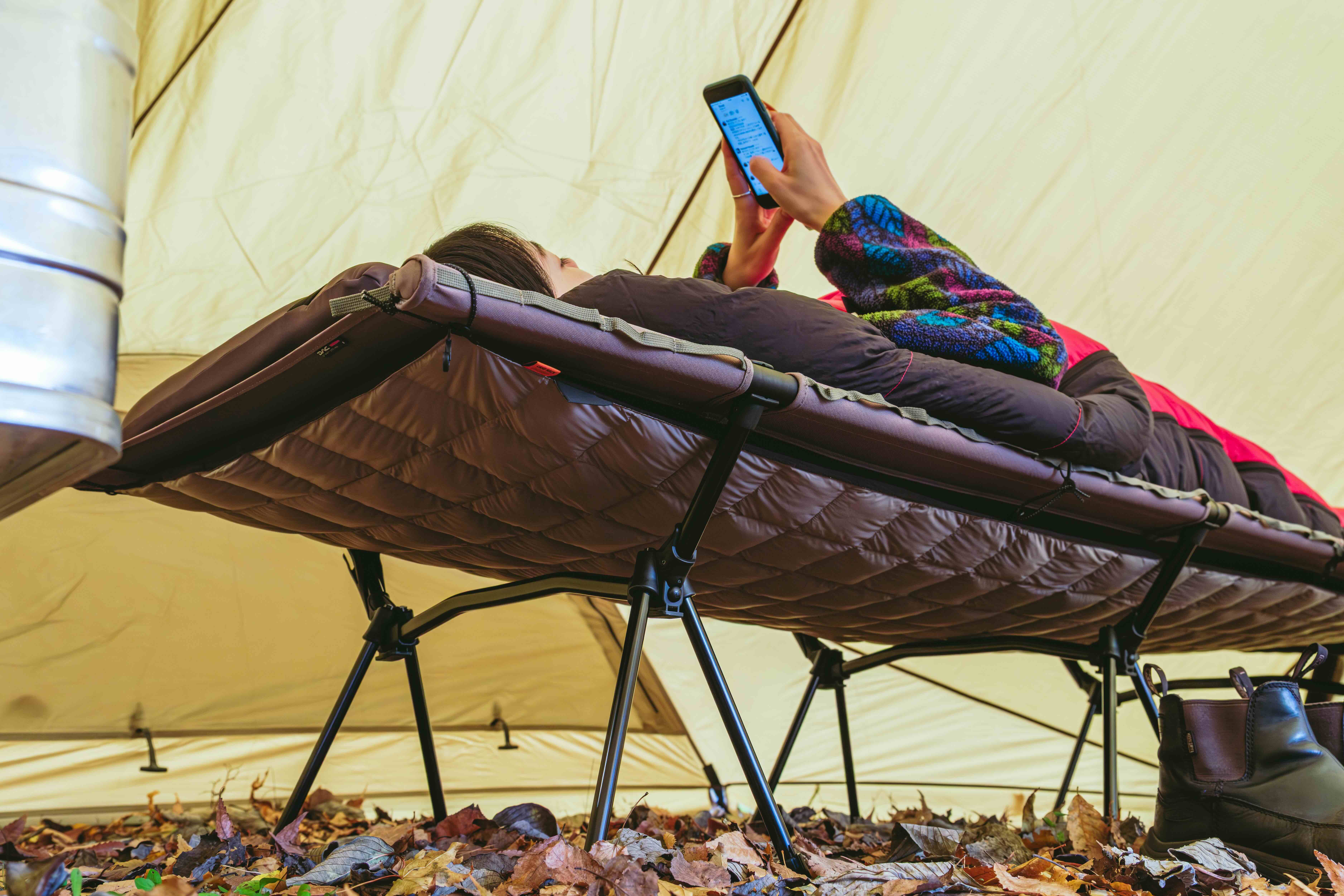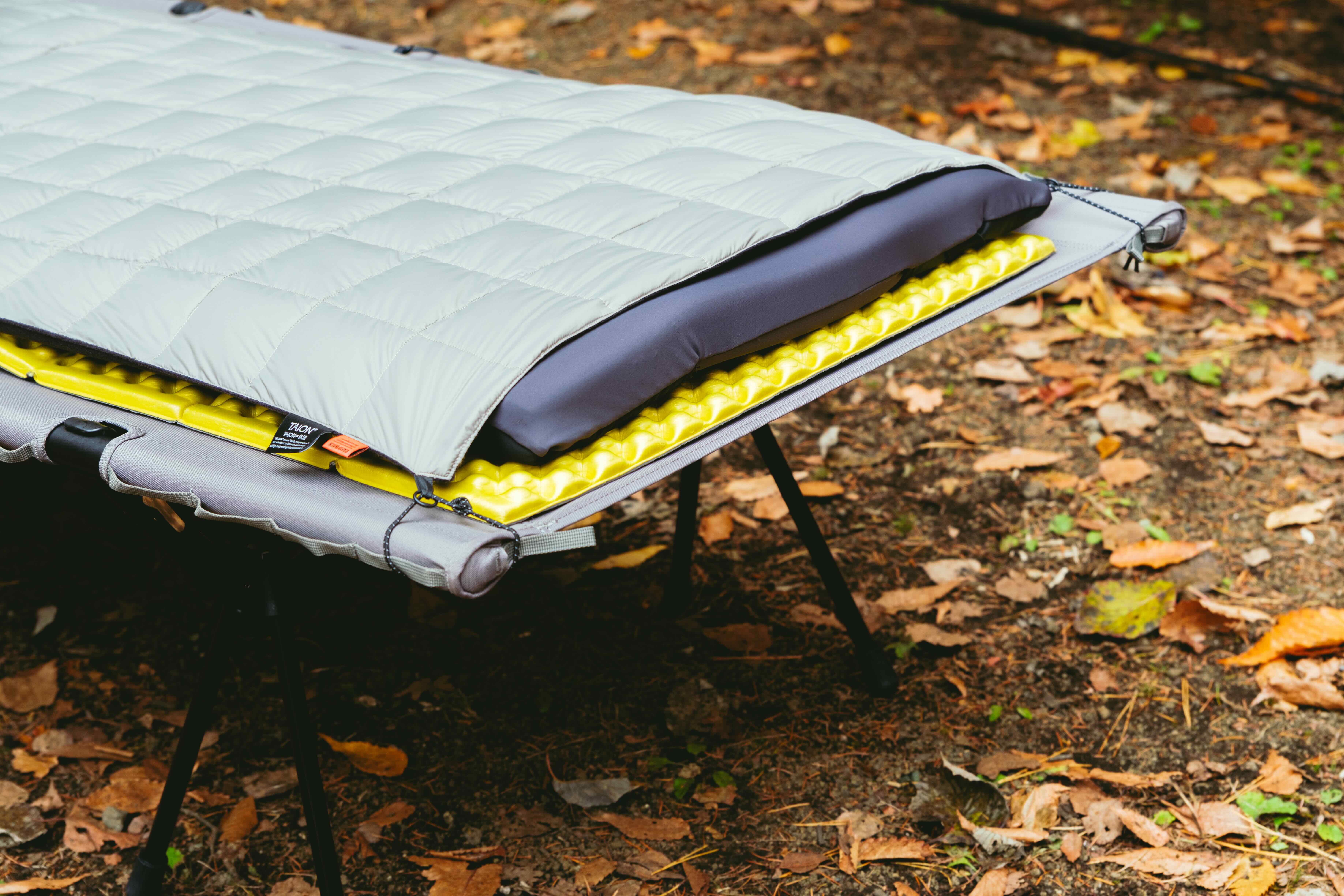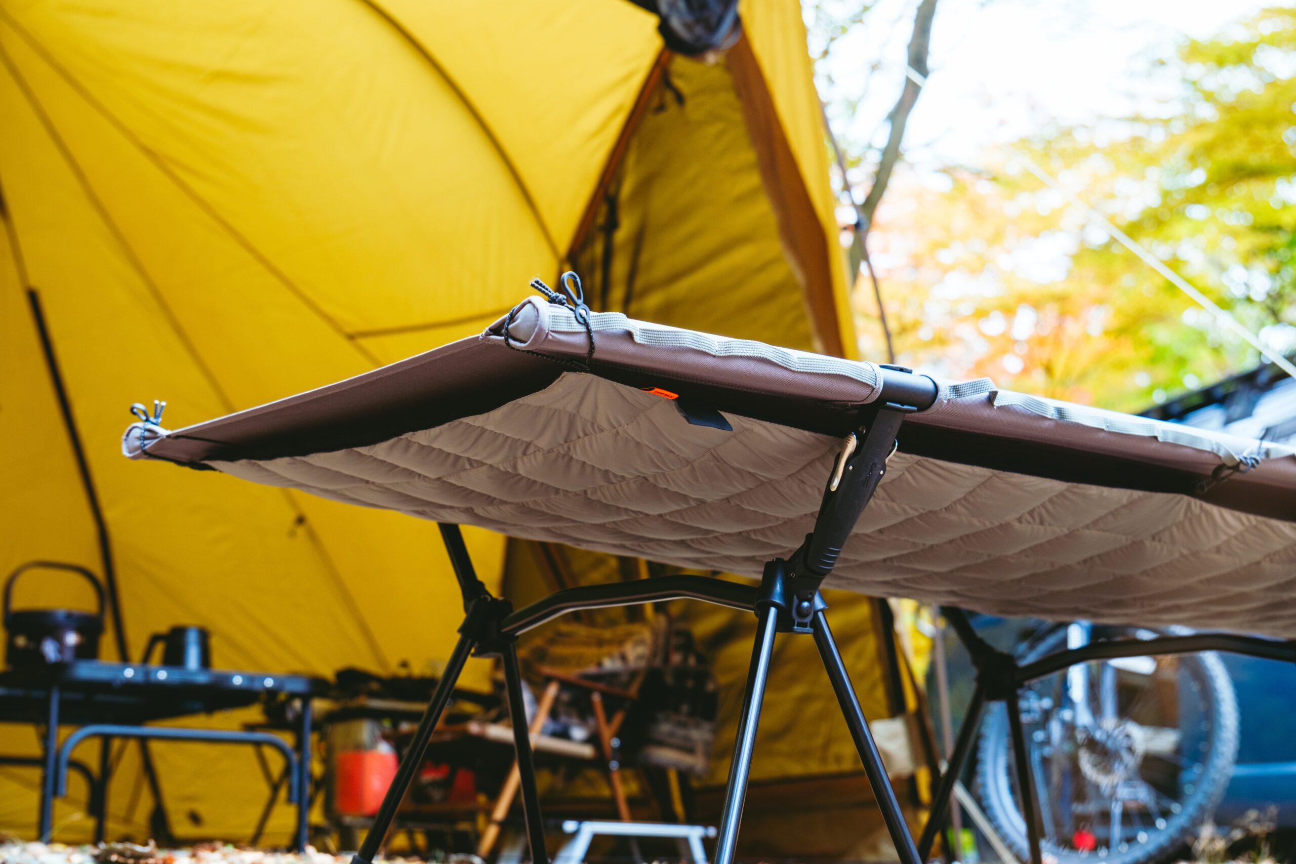 ダウンは潰れた状態だと保温力が発揮されませんが、コットの裏側に設置することでダウンが潰れず保温効果が高まり、地面からの底冷えを防げます。