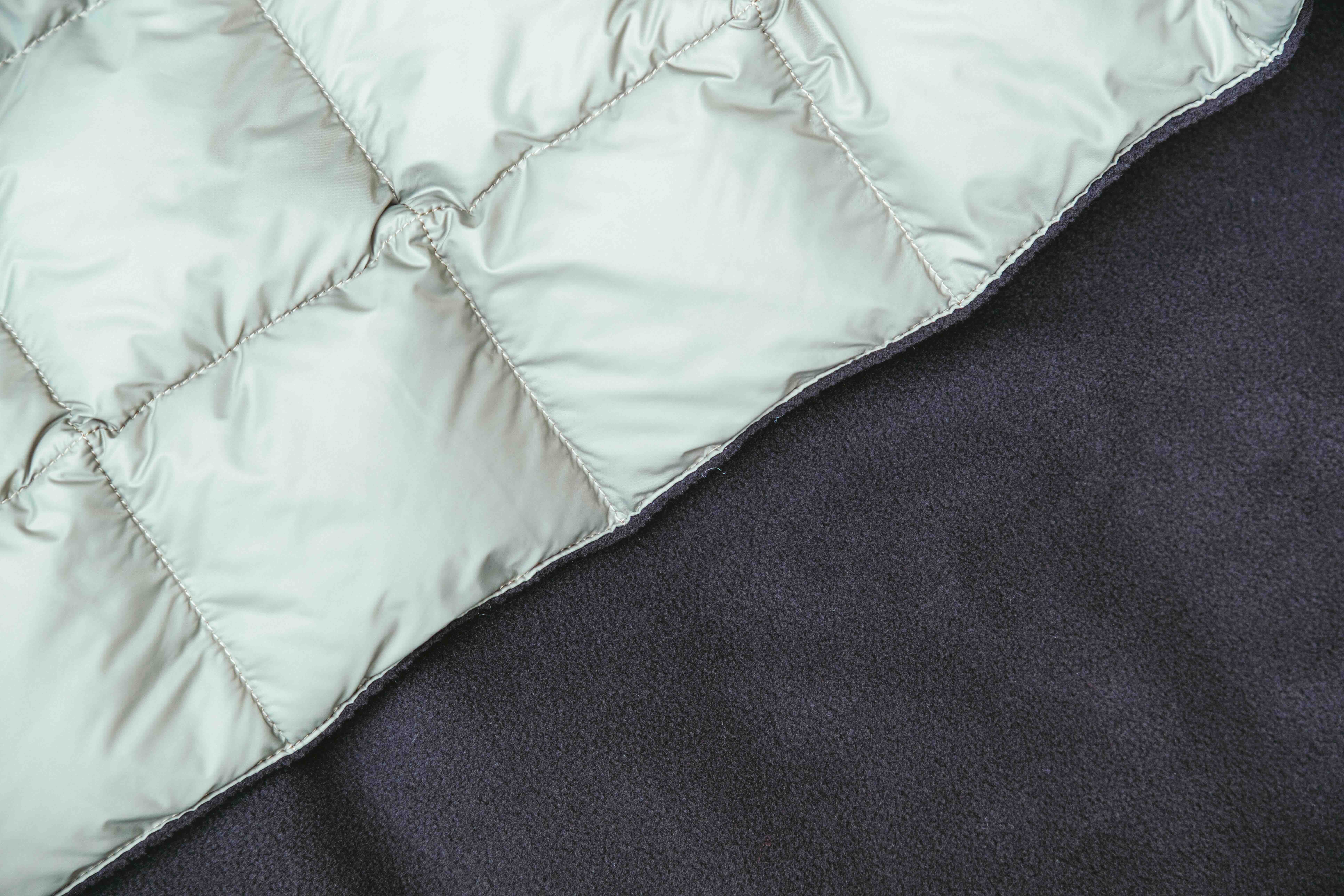 表面は800FPの羽毛を封入し、キルトステッチで仕上げたダウン。裏面はフリース素材と両面仕様のワイドダウンブランケット。