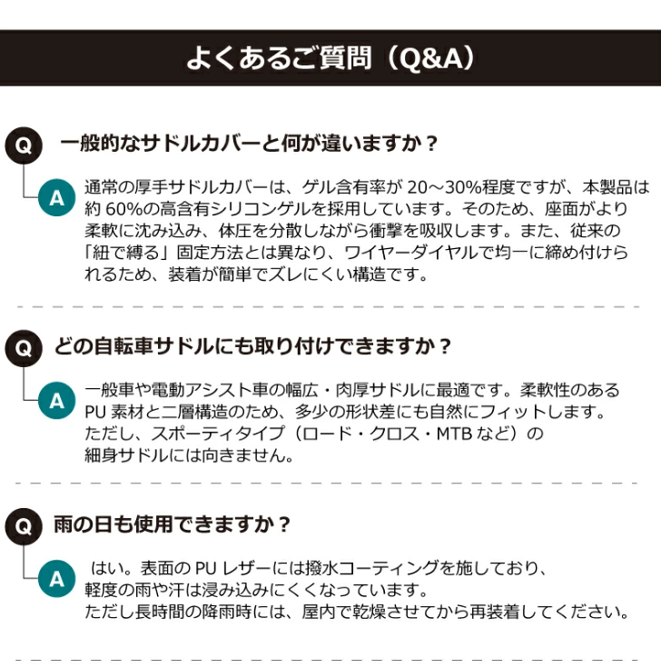 ・当製品は肉厚・幅広サドル用のサドルカバーです。スポーティ細身サドルには非対応 ・取付時はサドル中央を合わせ、ダイヤルをゆっくり回して締め付けてください。 ・締めすぎはワイヤー破損やカバー変形の原因となります。 ・長時間の雨天放置は避け、使用後は陰干ししてください。 ・洗濯機・乾燥機の使用は不可(表面PUレザーの劣化防止のため)。 ・火気・高温環境での保管は避けてください。