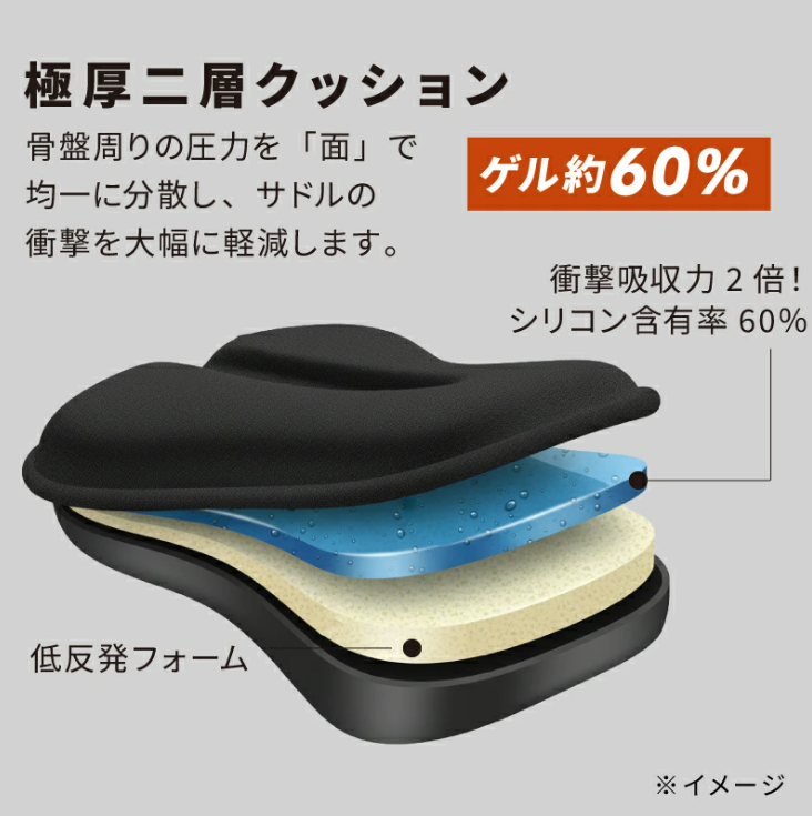 骨盤周りの圧力を「面」で均一に分散し、サドルの衝撃を大幅に軽減します。