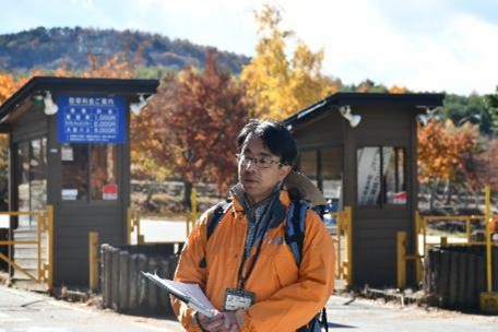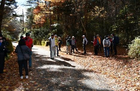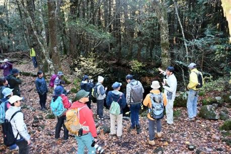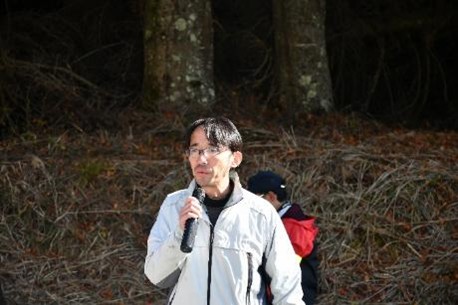 続いて、案内役の富士河口湖町教育委員会生涯学習課文化財係長の杉本悠樹学芸員が、精進口登山道の歴史と魅力について「精進口登山道は信仰登山道とは趣が異なり、大正期に林業用道路として開かれた比較的新しい登山道です。自然が豊かで、富士山の垂直分布の植物を観察できる自然の博物館ともいえる場所。精進口登山道や大室山周辺は、大正15年に天然記念物に指定されています」と紹介しました。