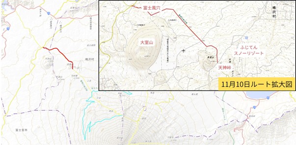 山梨県は令和7年11月10日(月)、富士山精進口登山道を舞台に、メディアや地元関係者に向けたファムトリップを開催しました。本企画は、古くから信仰の対象として人々に親しまれてきた富士山の文化的意義に触れ、伝統を守り続けてきた地域の歴史を感じてもらうため、古くから富士山麓で使われていた登山道(以下、古の登山道)の復興を目指して実施しました。今回のファムトリップには約30名が参加しました。参加者は、古の登山道の一つである「精進口登山道」のうち、天神峠から、大室山や富士風穴を経て山梨県道71号富士宮鳴沢線(以下、県道71号線)までの区間を歩きながら、豊かな自然植生や林業遺構などを見て回り、富士山の魅力を堪能しました。
