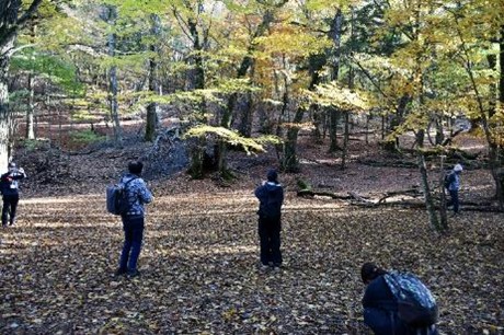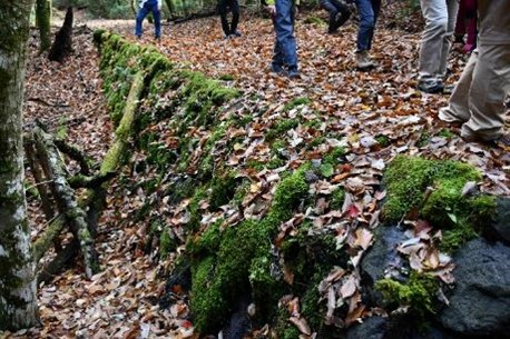 ゆるやかな下り道を歩くと、参加者は森の様子が変わっていくことに気づきます。明るい広葉樹の林から、針葉樹が優勢な深い森へと変わっているのです。