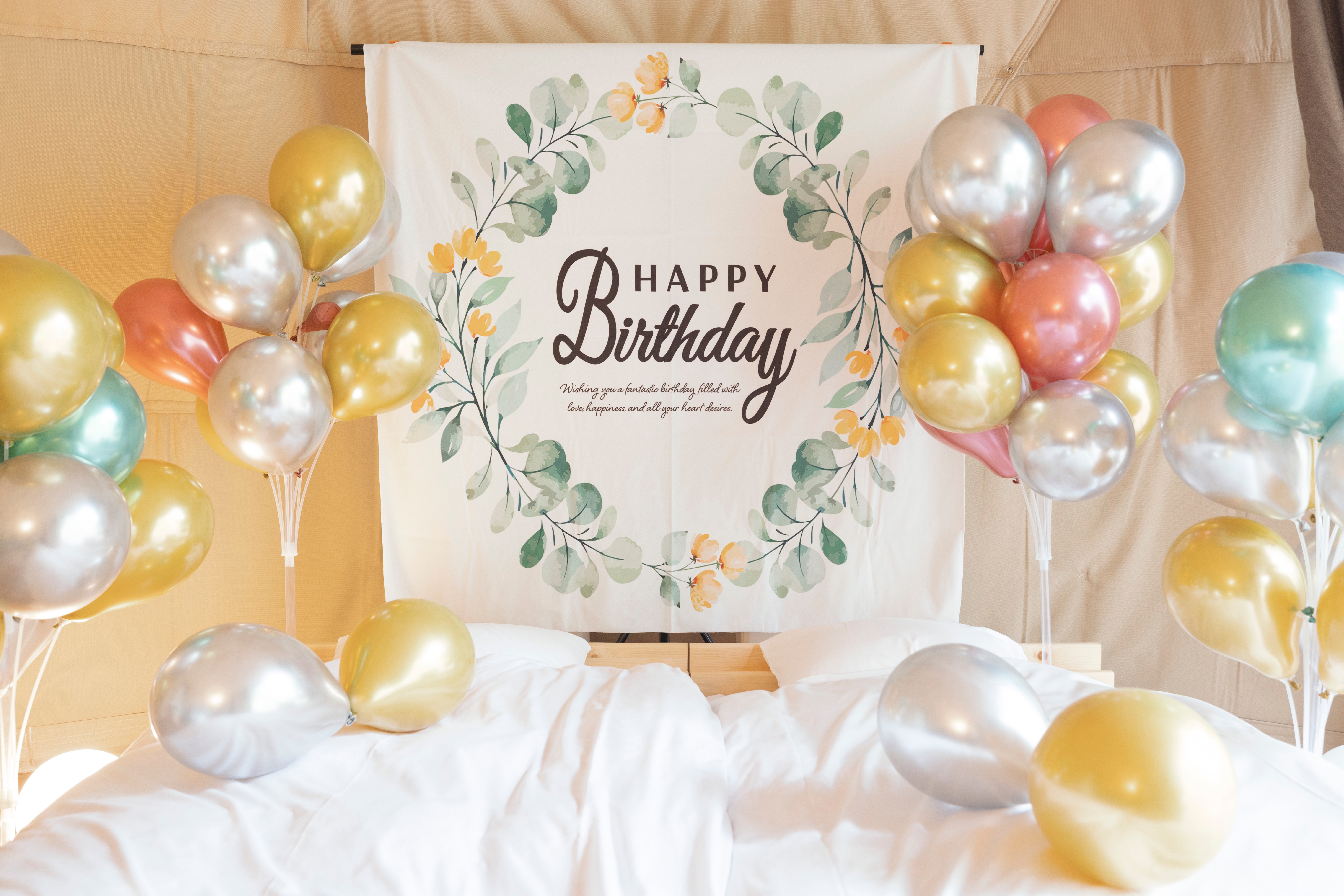 テント内はバルーンデコレーションで彩り、地元ケーキ店「hanauta」と提携した選べるホールケーキをご提供いたします。(標準でチーズケーキをご用意します。オプションで生クリームフルーツケーキやタルトケーキ等を選択いただけます)