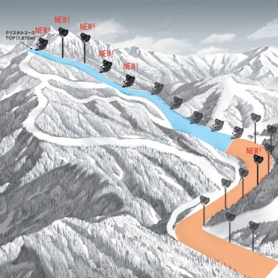 昨年度より実施していた総額2億円投資によるクリスタルコースへの人工降雪機を6基設置したことにより、安定したゲレンデ供給を実現いたします。